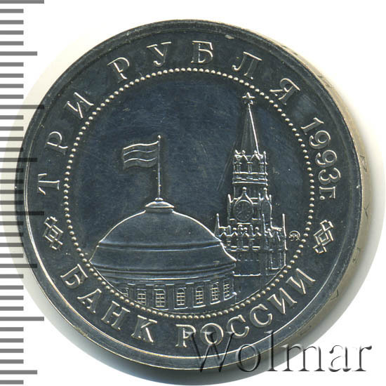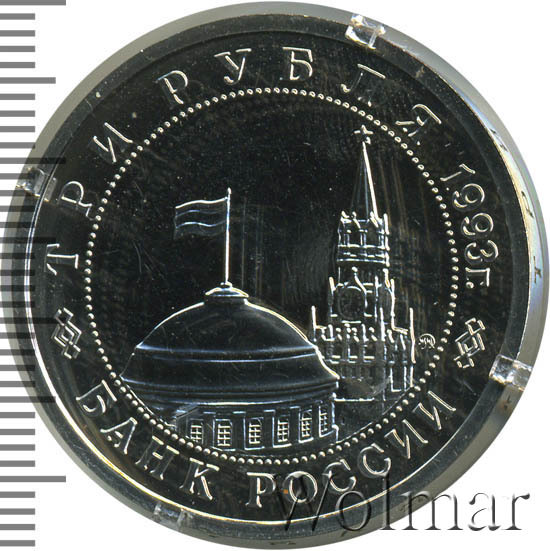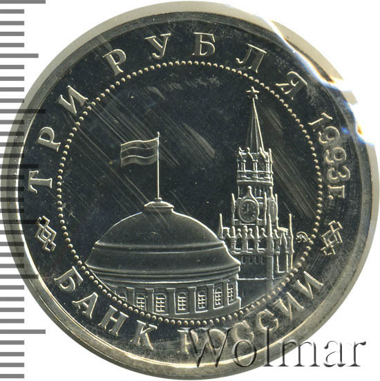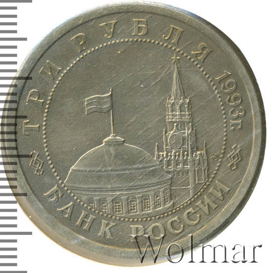 Вверху вдоль канта номинал «ТРИ РУБЛЯ» и год выпуска «1993 г.», внизу слова «БАНК РОССИИ». В середине в ободке из точек изображение Спасской башни Московского Кремля и частично перекрывающего ее купола Сенатского дворца с развевающимся флагом, с внутренней стороны точечного ободка справа монограмма монетного двора «ММД».