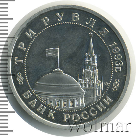 Вверху вдоль канта номинал «ТРИ РУБЛЯ» и год выпуска «1993 г.», внизу слова «БАНК РОССИИ». В середине в ободке из точек изображение Спасской башни Московского Кремля и частично перекрывающего ее купола Сенатского дворца с развевающимся флагом, с внутренней стороны точечного ободка справа монограмма монетного двора «ММД».