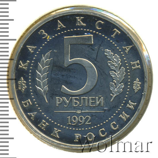 В центре диска - надпись в две строки: "5 РУБЛЕЙ", слева и справа от неё - лавровая и дубовая ветви, под словом "РУБЛЕЙ", в центре прерывистой линии - товарный знак монетного двора, ниже - дата "1992". По окружности - надписи, обрамлённые кругом из точек и разделённые орнаментом: вверху - "КАЗАКСТАН" (название на казахском языке Республики Казахстан), внизу - "БАНК РОССИИ".