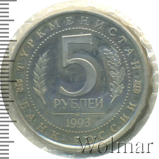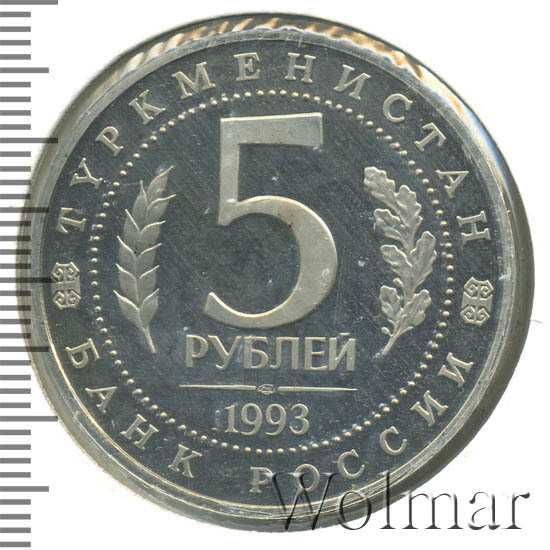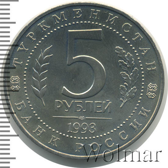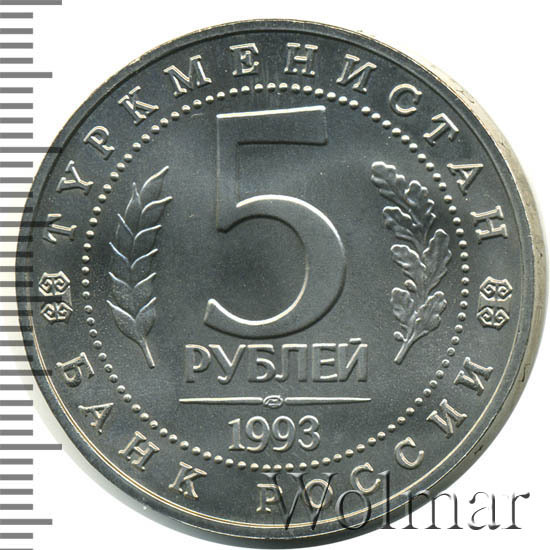 В центре диска - надпись в две строки: "5 РУБЛЕЙ", - слева и справа от неё - лавровая и дубовая ветви, под словом "РУБЛЕЙ", в центре прерывистой линии - товарный знак монетного двора, ниже - дата: "1993". По окружности надписи, обрамлённые кругом из точек: вверху - "ТУРКМЕНИСТАН", внизу - "БАНК РОССИИ".