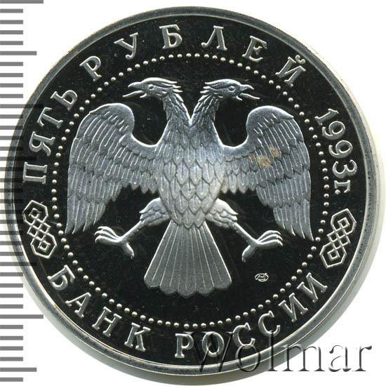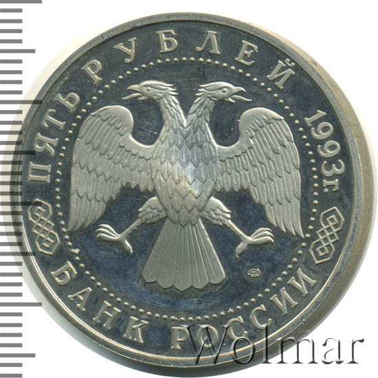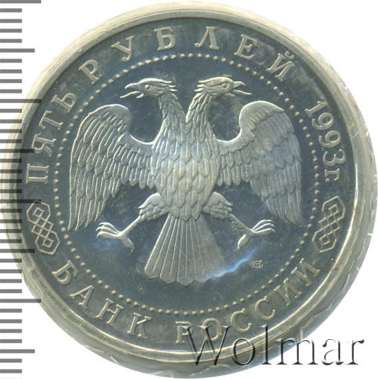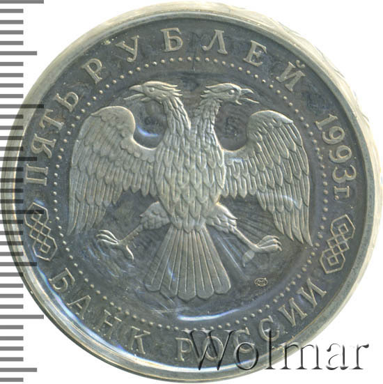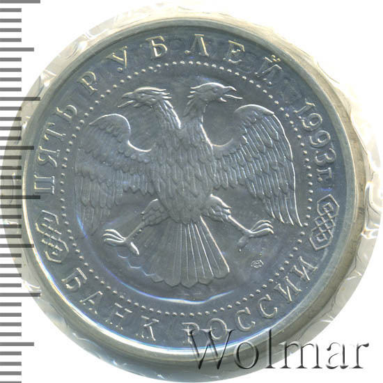 Вверху вдоль канта номинал «ПЯТЬ РУБЛЕЙ» и год выпуска «1993 г.», внизу слова «БАНК РОССИИ». В середине двуглавый орел под ним справа монограмма монетного двора «ЛМД».