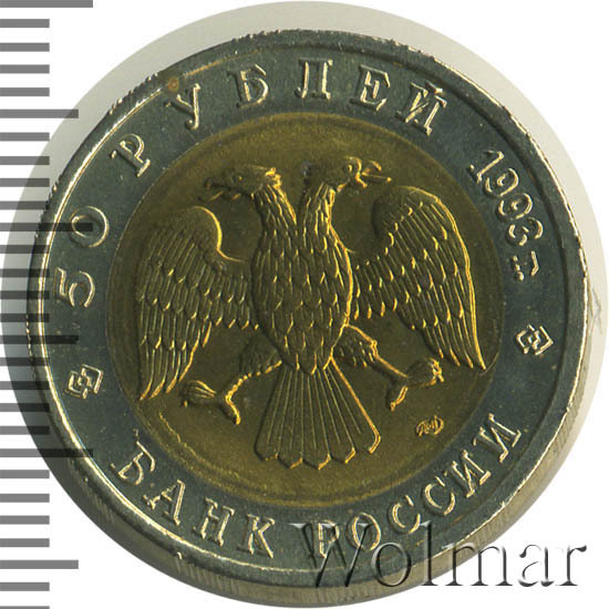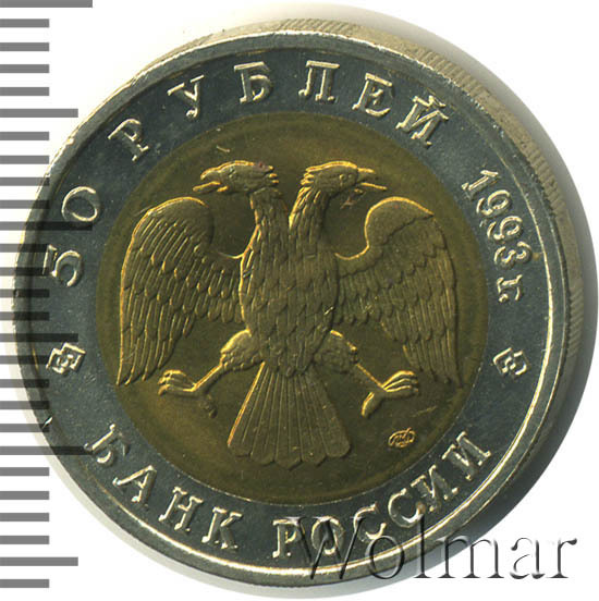 Вверху вдоль канта номинал «ПЯТЬДЕСЯТ РУБЛЕЙ» и год выпуска «1993 г.», внизу слова «БАНК РОССИИ». В середине двуглавый орел под ним справа монограмма монетного двора «ЛМД».