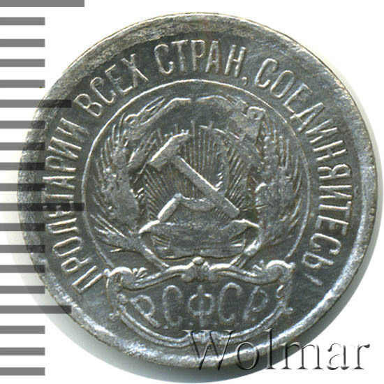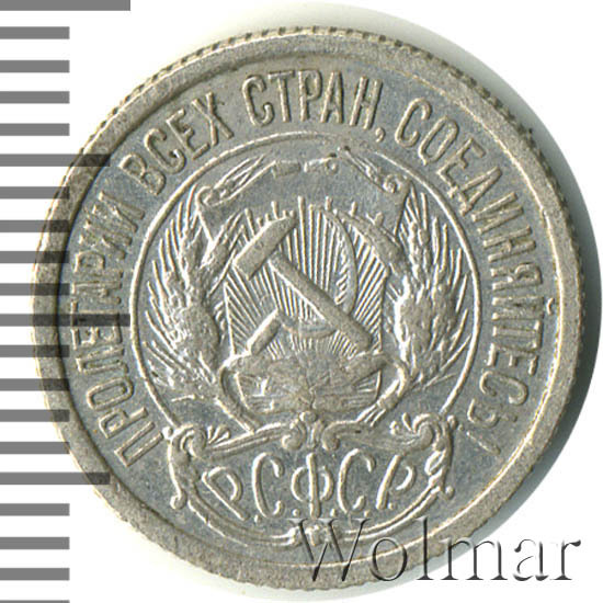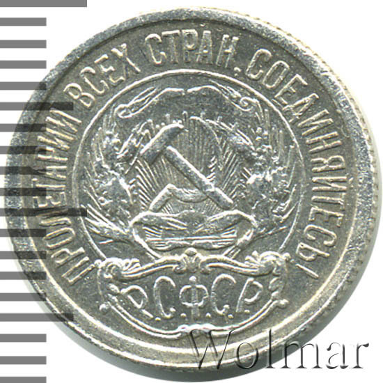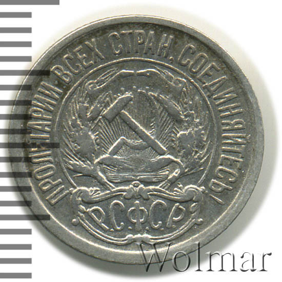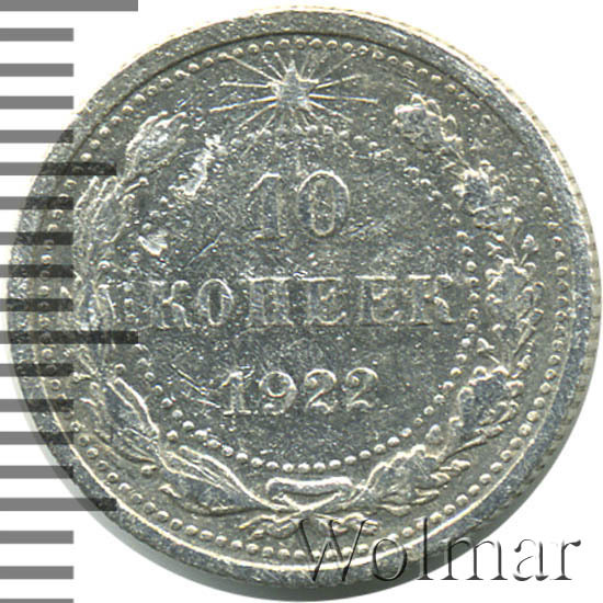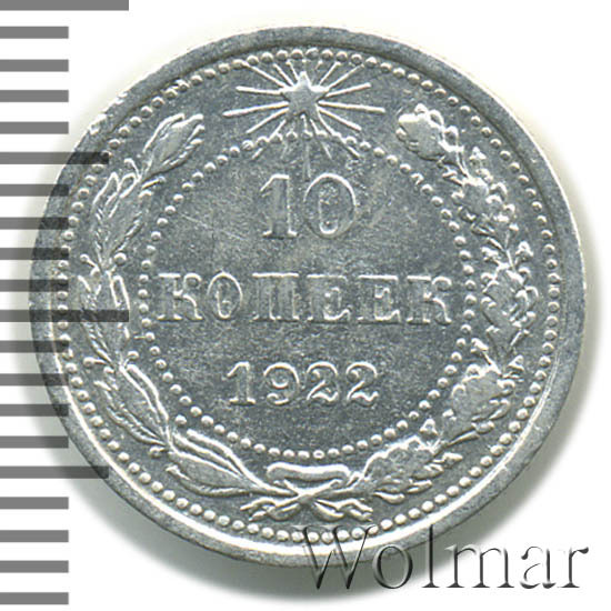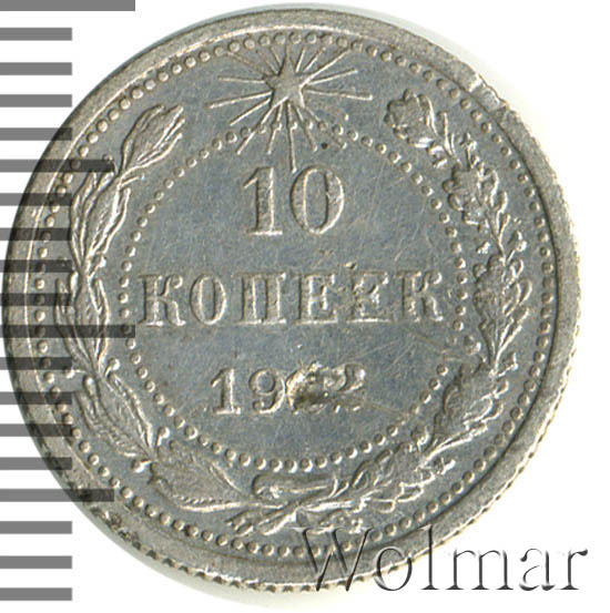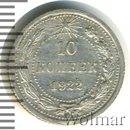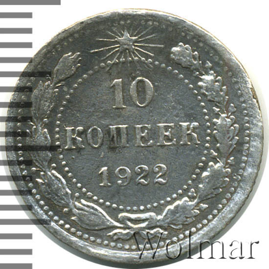 10 копеек 1922 года, рядовая, тиражная монета РСФСР образца 1921-1923 годов. Материал изготовления – билон (низкопробное серебро). Была младшей в линейки погодовки 1922 г.. Большая потребность в разменной мелочи нужд народного хозяйства РСФСР, обусловлен большой тираж этого номинала (18640 тысяч штук). Для рисунка обеих сторон этих монет за основу был взят дизайн царского мелкого серебра: корону заменили звездой, изменили герб и окаймили его девизом "Пролетарии всех стран, соединяйтесь!". Добавили точечный ободок. В обращении монеты РСФСР появились только в 1924 году, после стабилизации денежной системы страны и проведения третьей по счету деноминации. Вариантов по аверсу и реверсу нет.