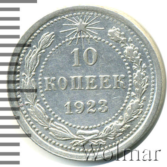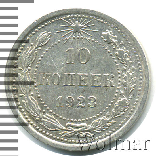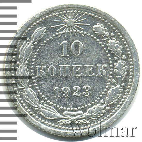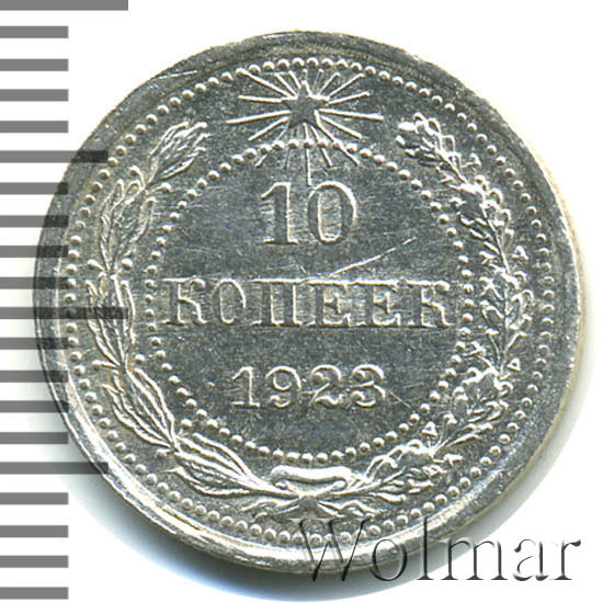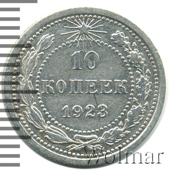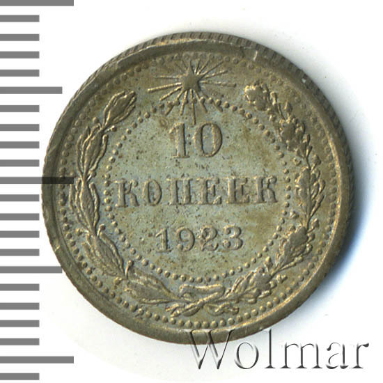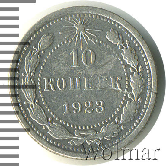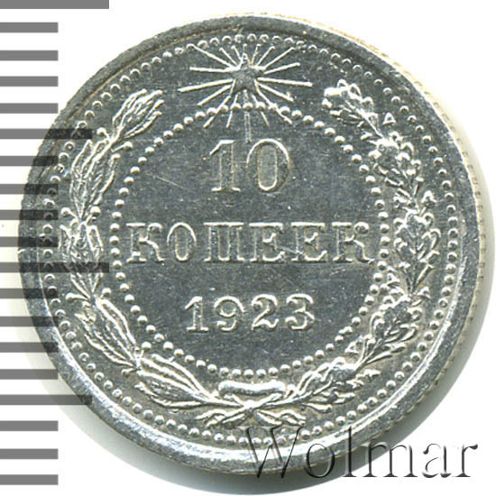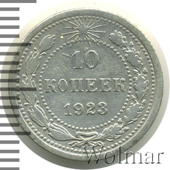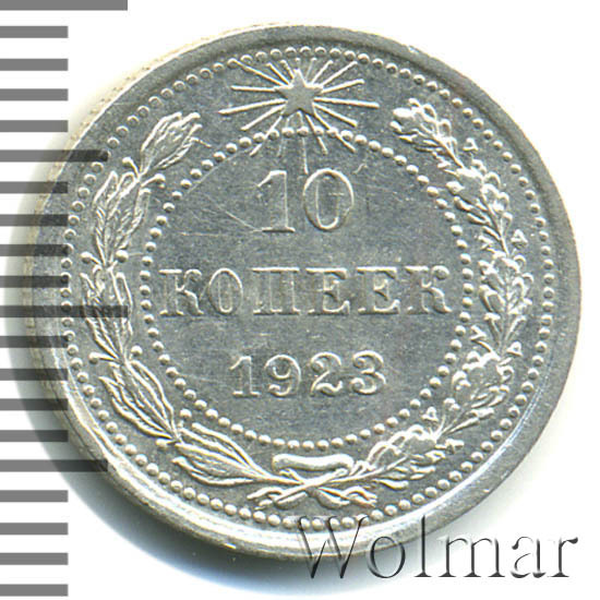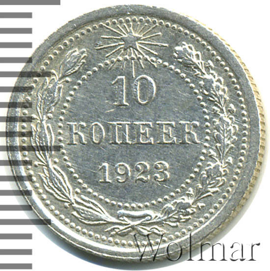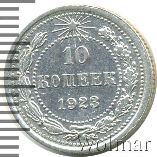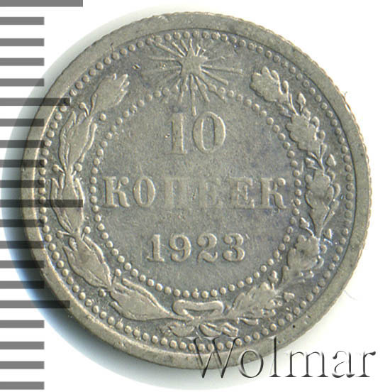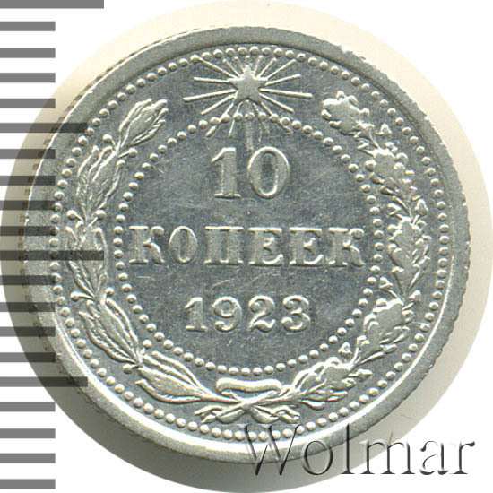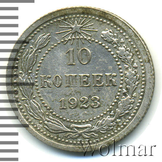Билоновая 10 копеек 1923 года, рядовая, тиражная монета РСФСР образца 1921-1923 годов. Материал изготовления – билон (низкопробное серебро 500 пробы). Разменные монеты РСФСР (10, 15, 20 копеек) чеканились из сплава серебра 500 пробы, старшие (50 коп. и 1 рубль) из серебра 900 пробы. Тираж, 10 копеек 1923 года, большой: 33424 тысяч штук. На мон. дворе была произведена и полирования чеканка этой монеты. Известных разновидностей нет. Изображение аверса: Государственный Герб РСФСР, окаймленный девизом: "Пролетарии всех стран, соединяйтесь!" Оборотная: в центре указан номинал, под ним год "1923". Вдоль канта изображен венок из лавровой и дубовой ветви, которые в нижней части перевязаны лентой на узел бантом. В денежном обращении такие монеты появились только в 1924 году, после стабилизации денежной системы страны.