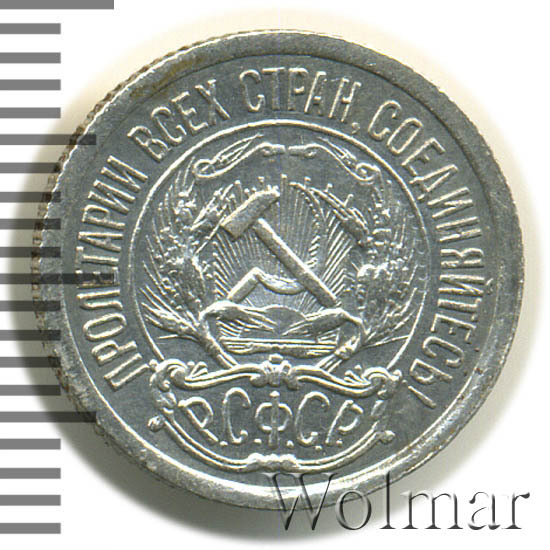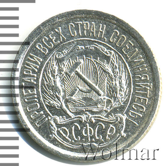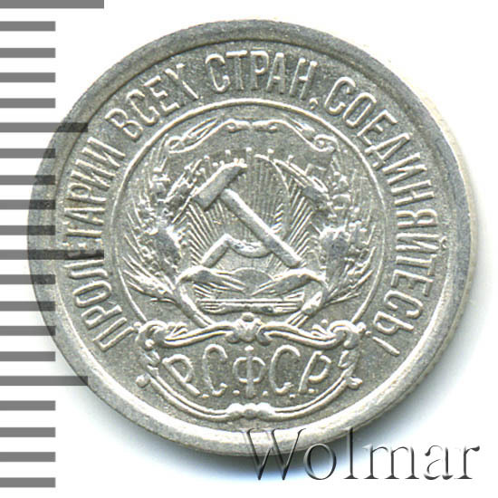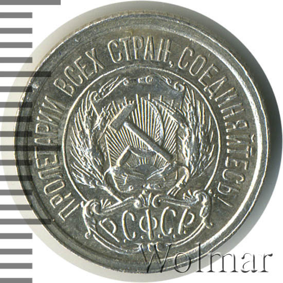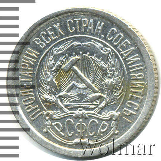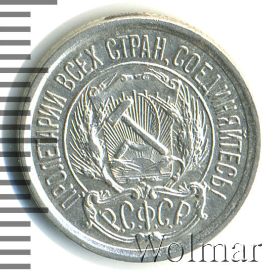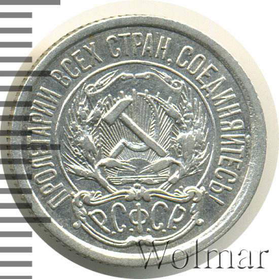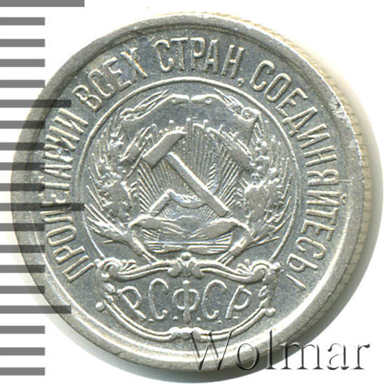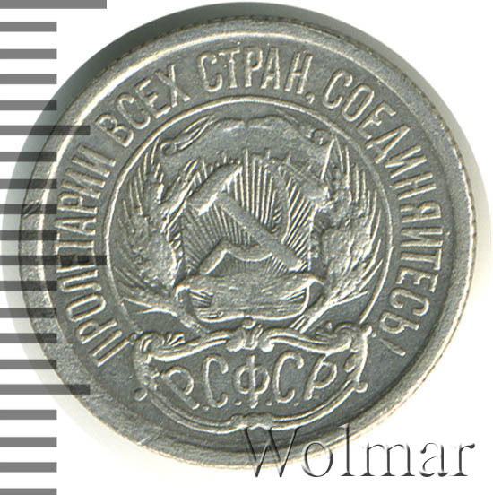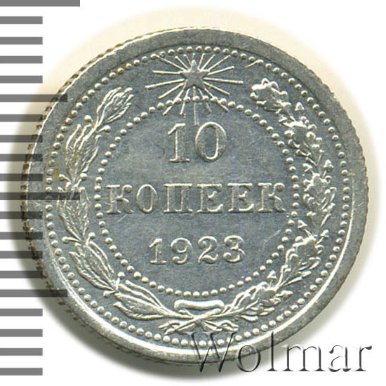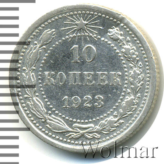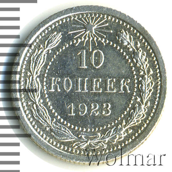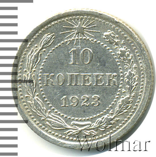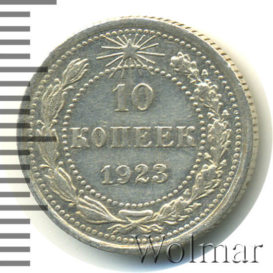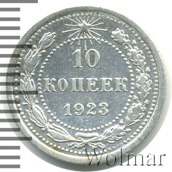 Билоновая 10 копеек 1923 года, рядовая, тиражная монета РСФСР образца 1921-1923 годов. Материал изготовления – билон (низкопробное серебро 500 пробы). Разменные монеты РСФСР (10, 15, 20 копеек) чеканились из сплава серебра 500 пробы, старшие (50 коп. и 1 рубль) из серебра 900 пробы. Тираж, 10 копеек 1923 года, большой: 33424 тысяч штук. На мон. дворе была произведена и полирования чеканка этой монеты. Известных разновидностей нет. Изображение аверса: Государственный Герб РСФСР, окаймленный девизом: "Пролетарии всех стран, соединяйтесь!" Оборотная: в центре указан номинал, под ним год "1923". Вдоль канта изображен венок из лавровой и дубовой ветви, которые в нижней части перевязаны лентой на узел бантом. В денежном обращении такие монеты появились только в 1924 году, после стабилизации денежной системы страны.