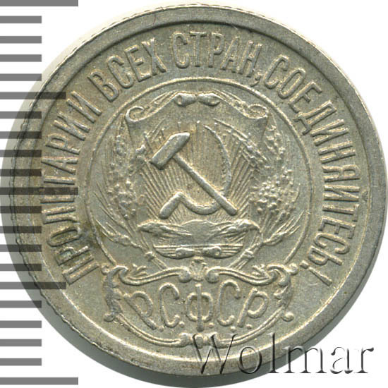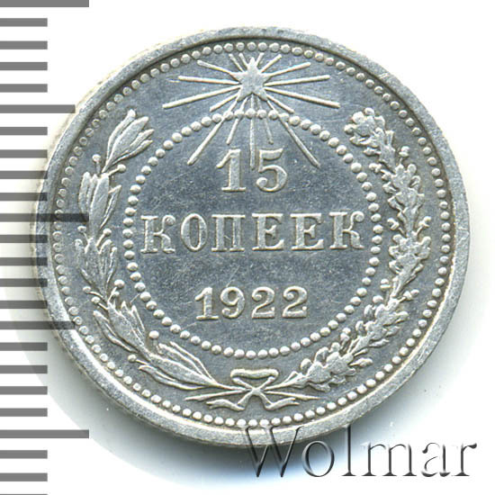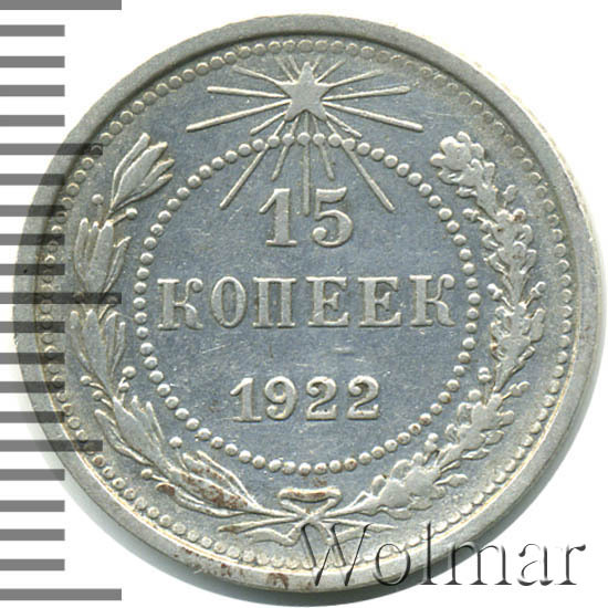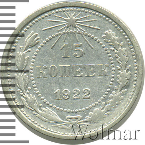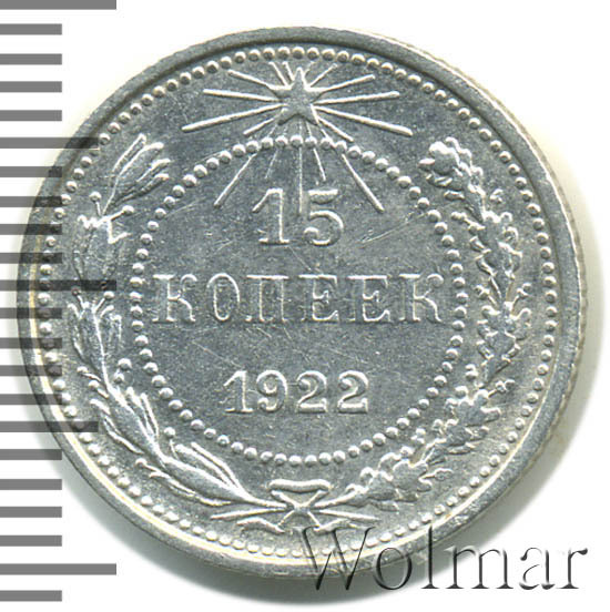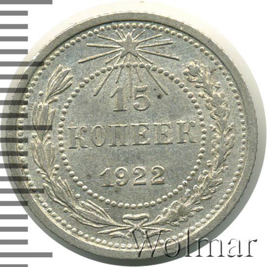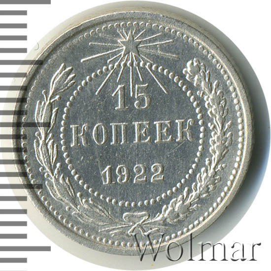 Петроградский монетный двор, на котором возобновилась производство разменных серебряных монет, простаивал с августа 1917 года и даже был переименован в медально – аффинажный завод, на котором изредка проводились работы только по изготовлению медалей и орденов. К осени 1921 года на ПМД вновь наладилось производство, началась чеканка монет. Одним из пяти номиналов погодовки этого года и были 15 копеек 1922 года, монета массовая, рядовая. Материал изготовления – низкопробное серебро 500 пробы. Разновидностей не имеет. Стоимость определяемся состоянием отдельно взятого экземпляра.