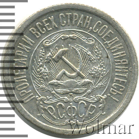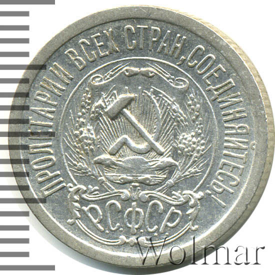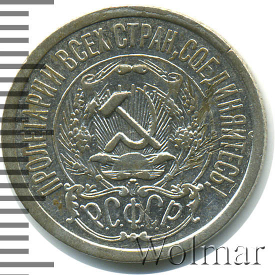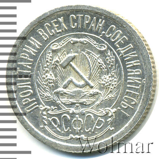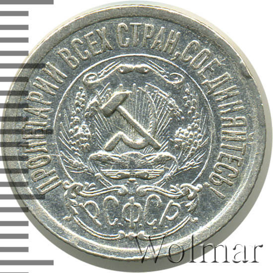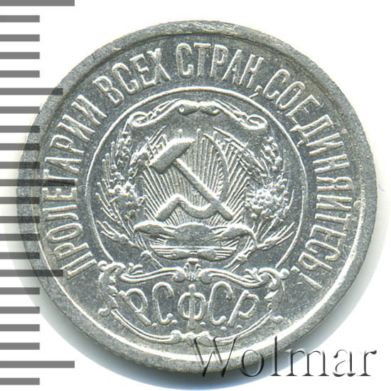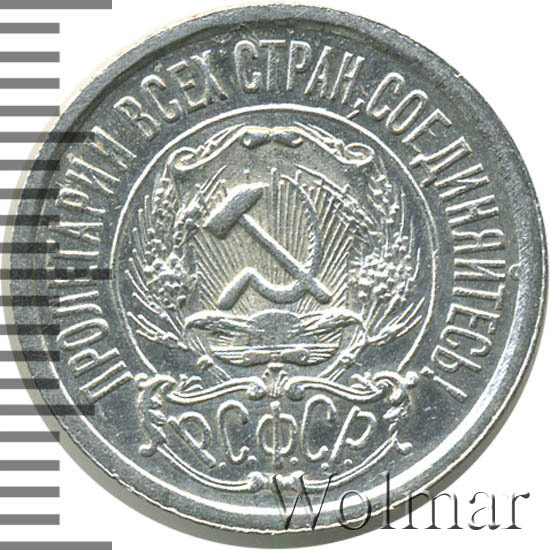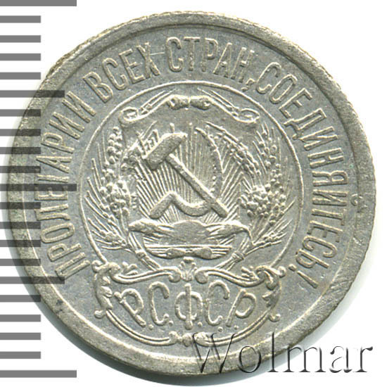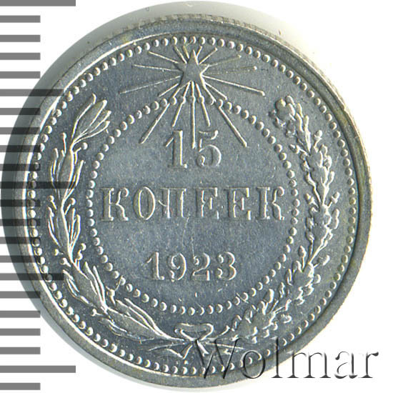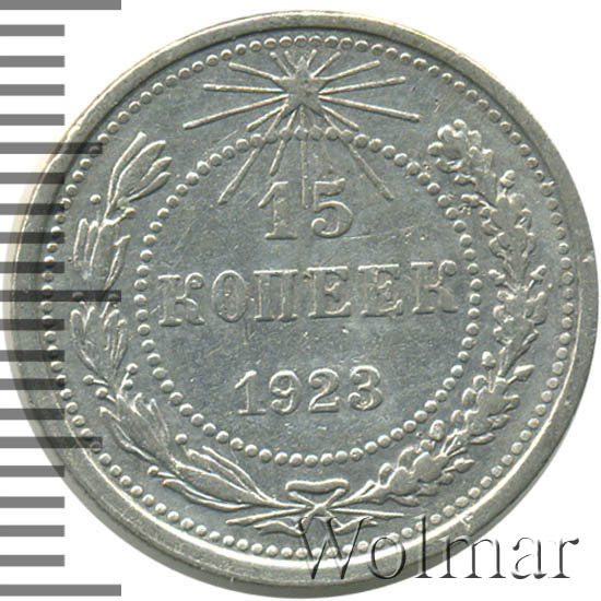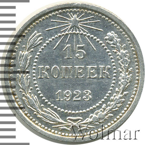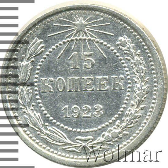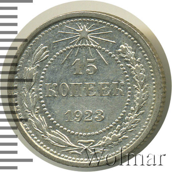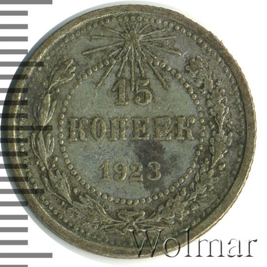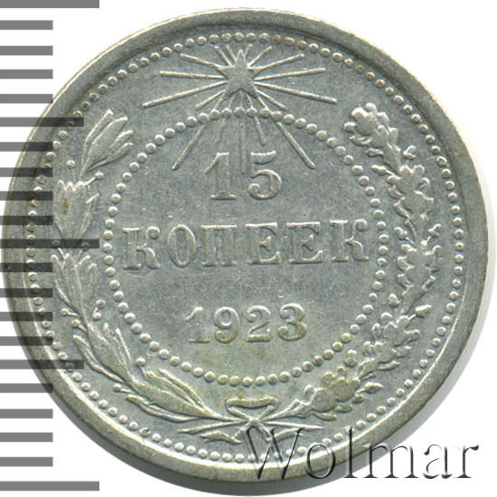 15 копеек 1923 года в оформлении во многом похожи на царские серебряные монетки, или как их ещё называли в старину пятиалтынники. Например, как и на монетах Николая II, мы видим практически не видоизменённый венок из лавровой и дубовой ветвей на реверсе. Двуглавого орла, правда, большевикам пришлось заменить на новый герб, а имперскую корону сменить на маленькую лучистую звёздочку, но в целом монетная стопа, размер, вес и проба серебра были неизменными, как и для монет конца XIX - начала XX веков. Сделано это было в основном из-за необходимости обеспечить новые деньги большей стабильностью и доверием среди населения, уставшего от деноминаций и бумажных денег времён гражданской войны.