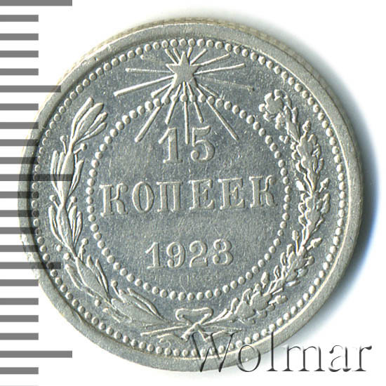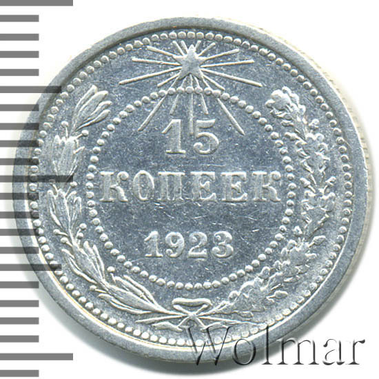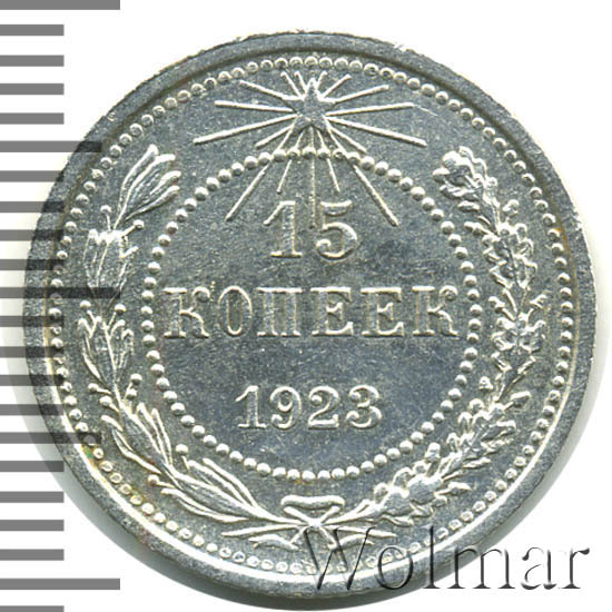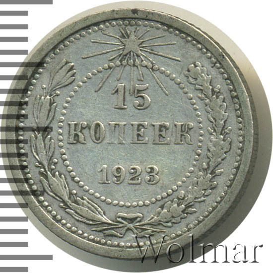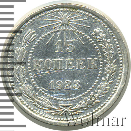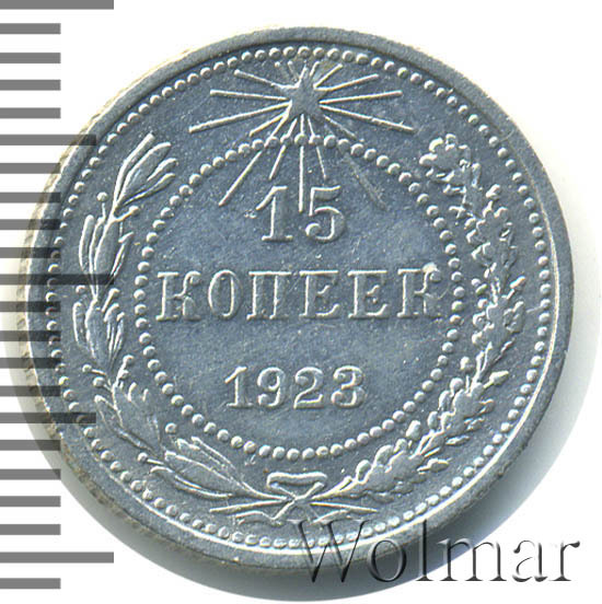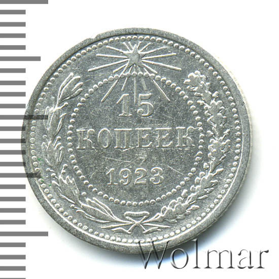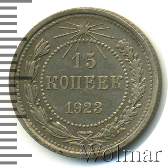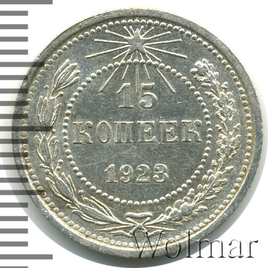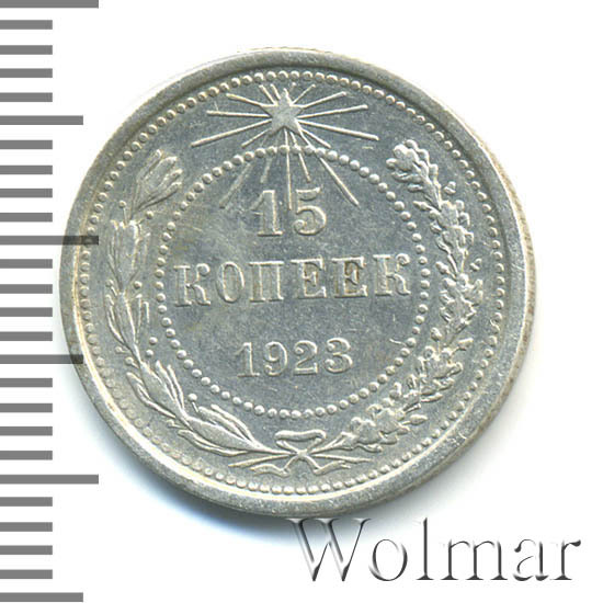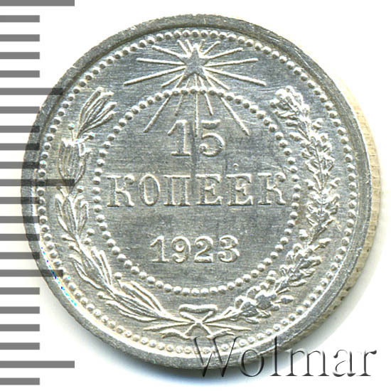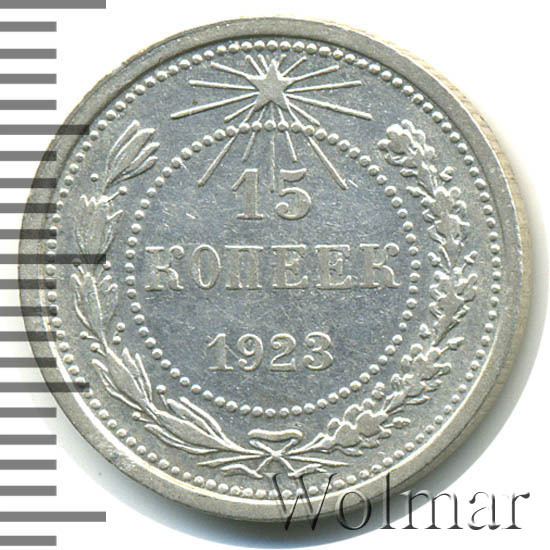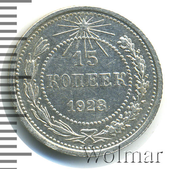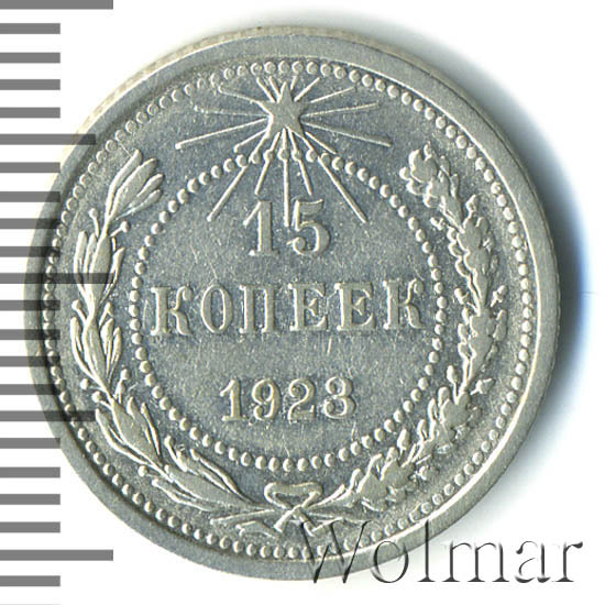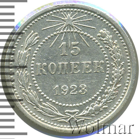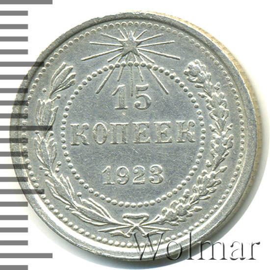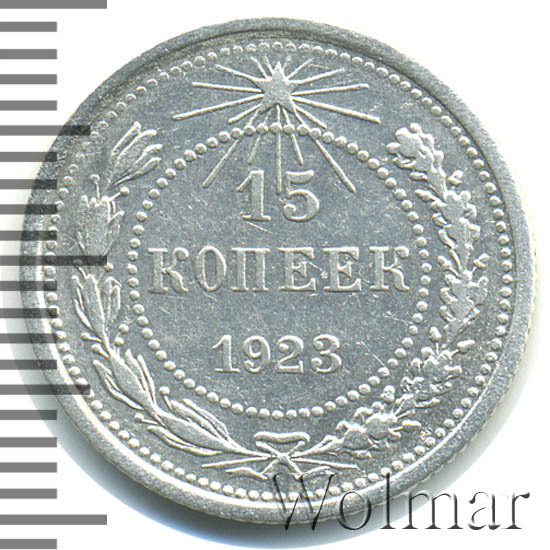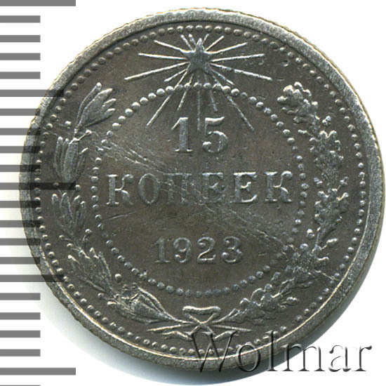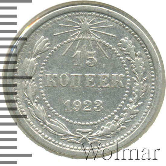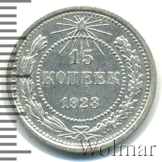 В точечном ободке указан номинал - цифра 15 под ней слово копеек, ниже дата 1923. Вдоль канта, большой точечный ободок, между ним и внутренним изображение венка из лавровой и дубовой ветвей, которые в нижней части связаны лентой с бантом. Сверху над номиналом пятиконечная звездочка в стороны от которой расходятся лучи разной длинны.