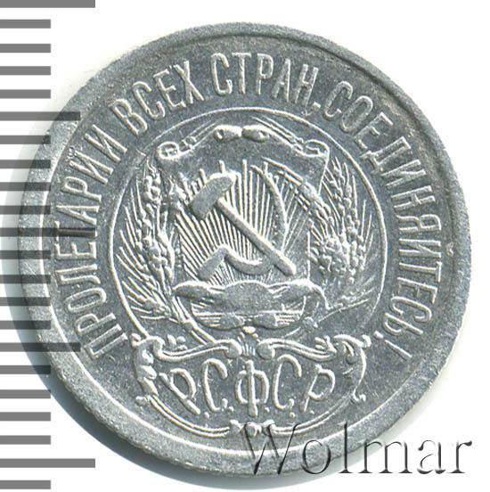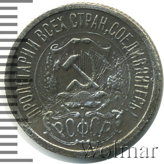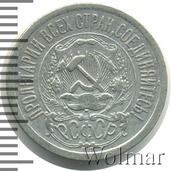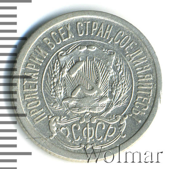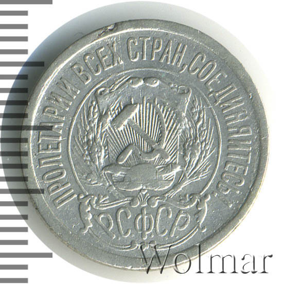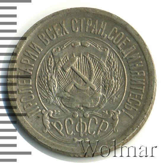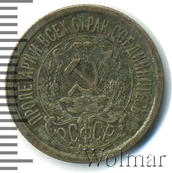 В центре изображён герб молодого государства - скрещенные серп и молот на фоне щитка, снизу которого восходит солнечный диск со множеством лучей, слева и справа щит обрамлён пшеничными колосьями. Под гербом надпись Р.С.Ф.С.Р. (Российская Советская Федеративная Социалистическая Республика). По кругу надпись-лозунг, отделённая от герба линейным ободком: "пролетарии всех стран, соединяйтесь!"