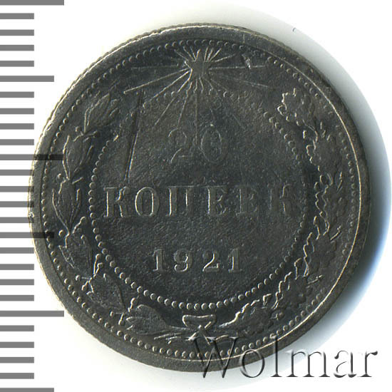 Двадцать копеек 1921 года, разменная, тиражная монета, выполненная из билона (серебро 500 пробы). Чеканка велась на Петроградском монетном дворе. Имеет две равнозначные разновидности (см.описание аверса), также была выполнена в специальном (полированном) чекане.