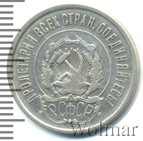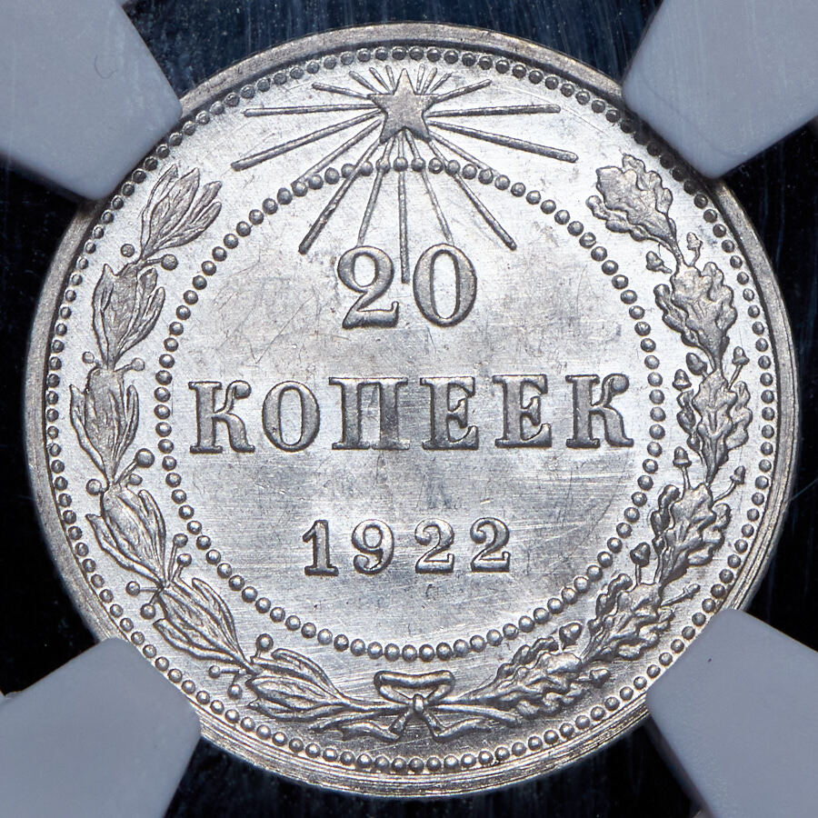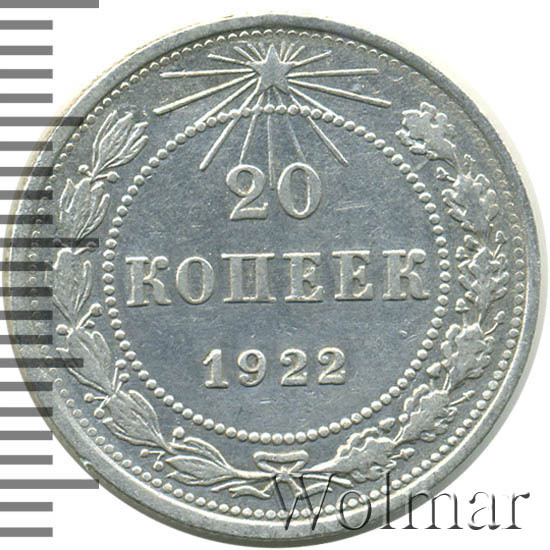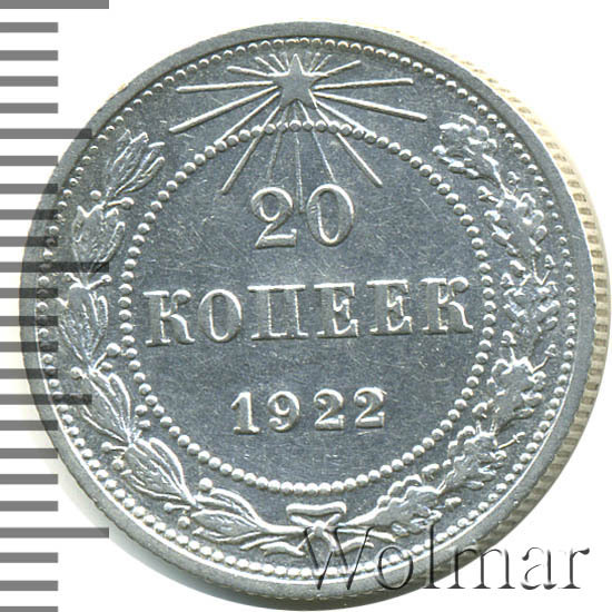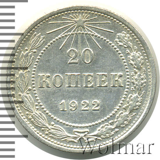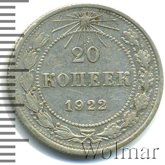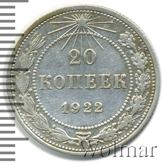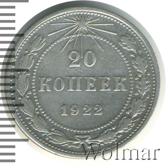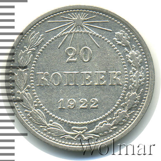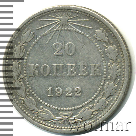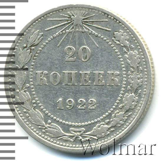 Двадцать копеек двадцать второго года, рядовая, тиражная монета РСФСР образца 1921-1923 годов. Чеканилась на Петроградском монетном дворе (ПМД), как и остальные четыре номинала, выпущенные в денежное обращение с датой 1922 г Материал изготовления – билон, немагнитный сплав низкопробного серебра, белого цвета. Отношение аверса к реверсу – 0 градусов, так называемое - медальное. Тираж: 14220 тысяч штук. Разменные монеты РСФСР (10, 15, 20 копеек) чеканились из сплава серебра 500 пробы, старшие (50 коп. и 1 рубль) из серебра высокой 900 пробы.
