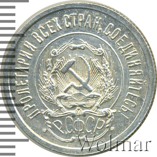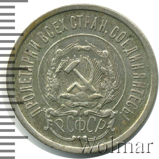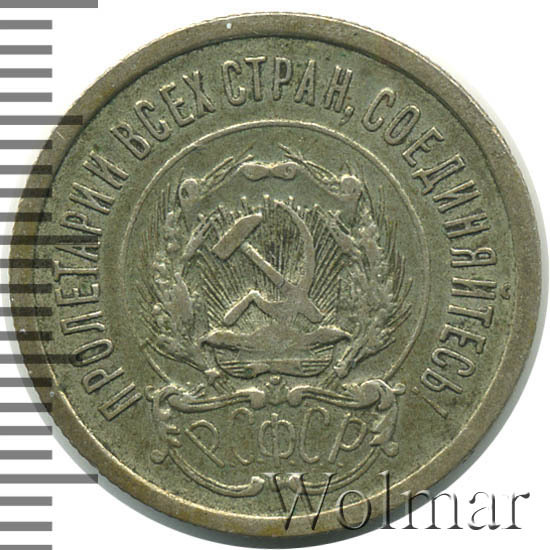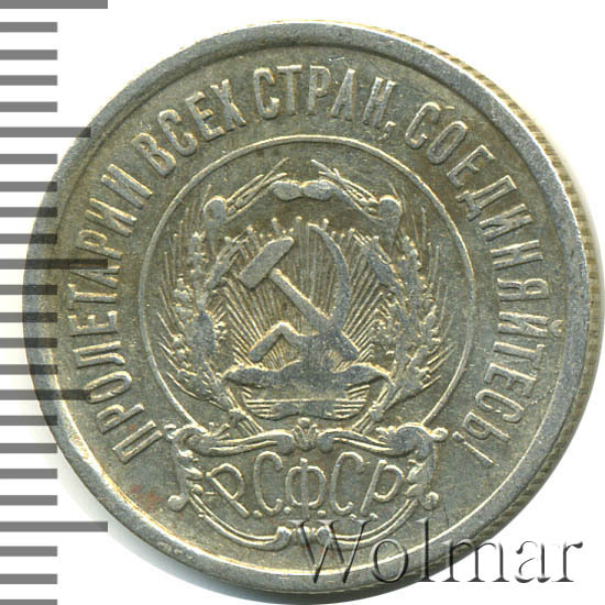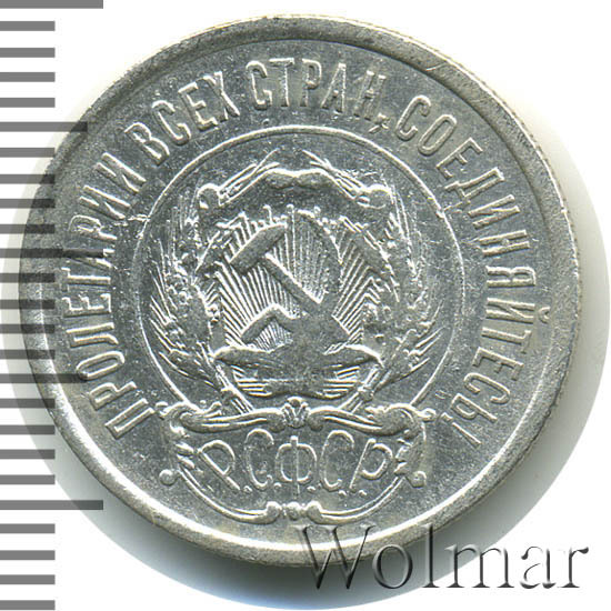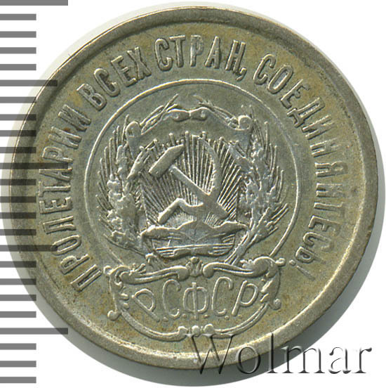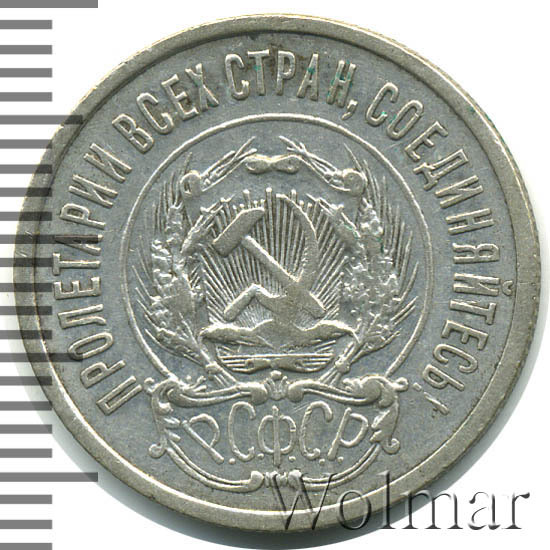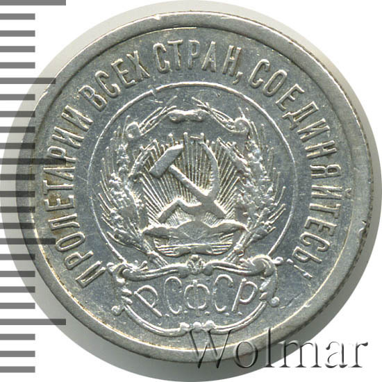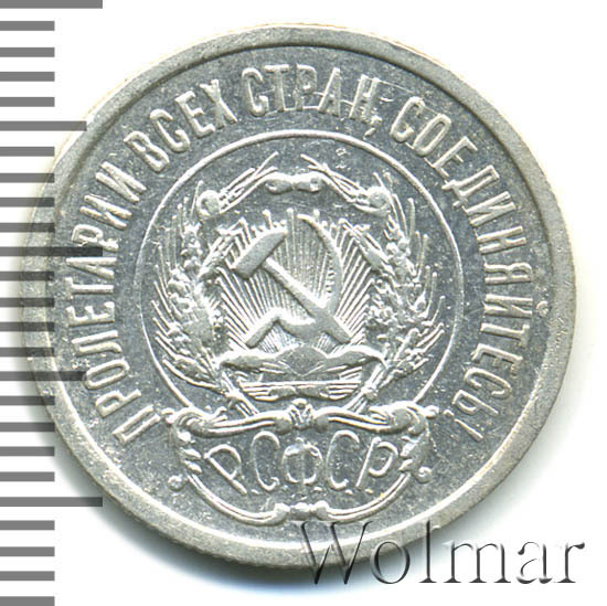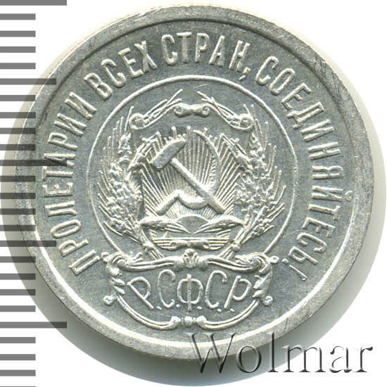 Разменная монета РСФСР ценой в 20 копеек. Чеканились на Петроградском монетном дворе. Массовая, рядовая монета. Тираж (предположительно) 27580 тысяч штук. Монеты с датой 1923 чеканилась только трёх номиналов (10,15 и 20 копеек). Материал чеканки – билон. Тип гербовой стороны у всех монет молодой Республики Советов был одинаков: Герб РСФСР, и девиз: "Пролетарии всех стран, соединяйтесь!". Оборотная сторона: у мелких (билона) и у крупных (1 рубль и пятьдесят копеек) номиналов, отличалась. 20 коп. 1923 г. имеет 2 разновидности. Одна из них – шт. 1.1 (Ф№5) оценена в 100$. Также была выполнена в полированном (специальном) чекане (Ф№7П), оценка 1500$. Есть пробные монеты, выполненные в других металлах (бронзе, белом металле). Стоимость этих монет высока. Ниже, на основе прошедших аукционов, самых популярных интернет площадках, приведены статистические данные. По ним Вы можете узнать объективную стоимость 20 копеек 1923 года в полированном и обычном чекане.
