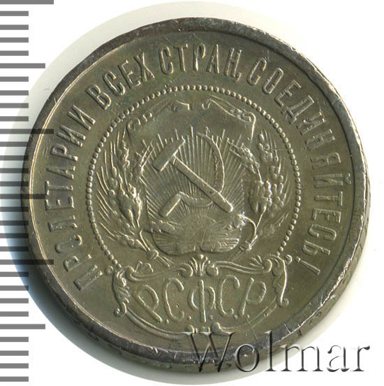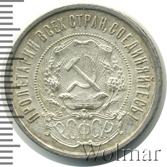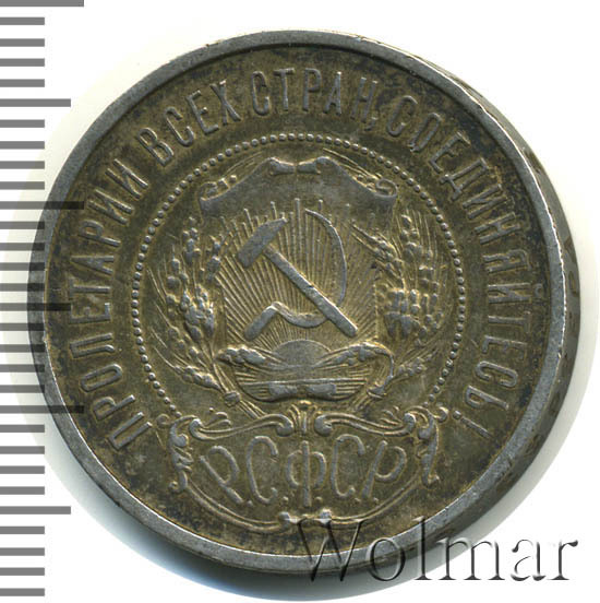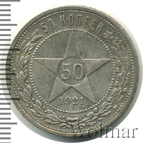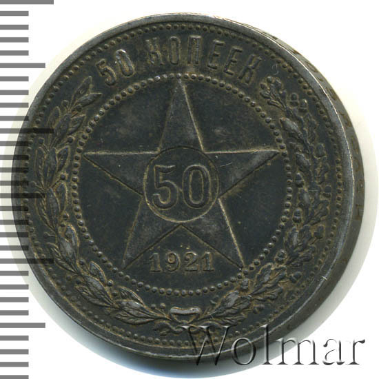 50 копеек 1921 года - одна из первых крупных советских монет изготавливалась из серебра 900 пробы. Гурт полтинника украшала вдавленная круговая надпись, выполненная старославянским шрифтом, гласящая о содержании благородного металла в золотниковой системе проб. Ещё на гурте указаны буквы (А.Г), означающие инициалы начальника Петроградского монетного двора того времени - Артура Федоровича Гартмана.