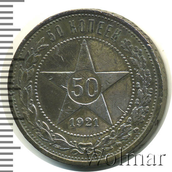 Нумизматами всегда ценились идеальные и отличные монетки, хранившиеся в коллекциях практически с первых дней выпуска, а вот если, допустим, монетой играли детишки в орлянку или она пол века провалялась в банке с ржавыми шурупами такой экземпляр будет привлекателен разве что только "пионерам" от нумизматики. Стоимость 50 копеек 1921 в зависимости от состояния может заметно отличаться, например, с битым гуртом и сильными царапинами или забоинами на поле, монета будет стоить всего на 30-50 процентов дороже цены драгоценного металла, а вот за приятный полтинничек без следов обращения и с штемпельным блеском можно запросто просить в 10-15 раз дороже цены для средненького состояния VF.
