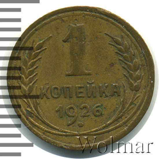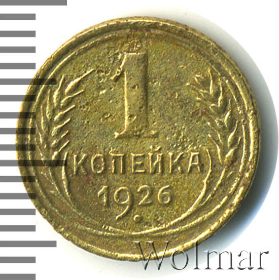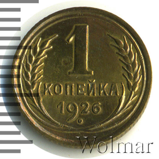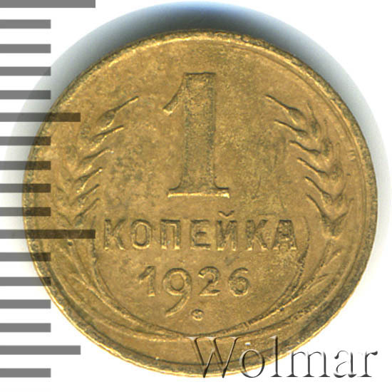 Одно копеечные номиналы, образца двадцать шестого – тридцать пятого годов, чеканились на Ленинградском монетном дворе (ЛМД). В этом году было отчеканено всего пять номиналов разменных денег для денежного оборота молодой Страны Советов. 1 коп. 1926 г. небольшая монетка, весом всего в один грамм. Производились из немагнитного сплава алюминиевой бронзы, жёлтого цвета. Тираж большой: 87915 тысяч штук. Цена 1 коп. 1926 г. в отличном коллекционном состоянии UNC несколько раз превышает стоимость монеты в среднем состоянии VF.