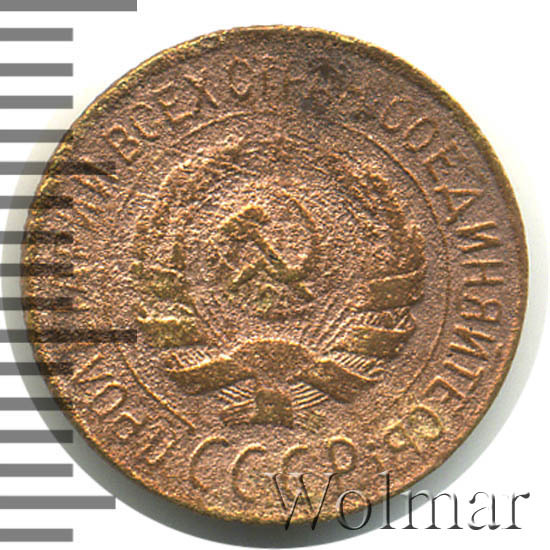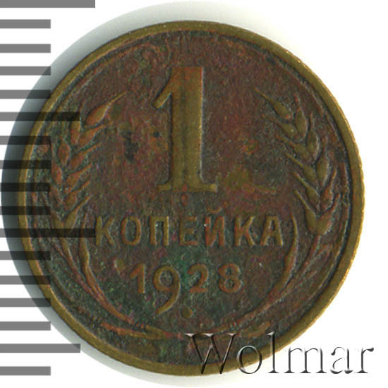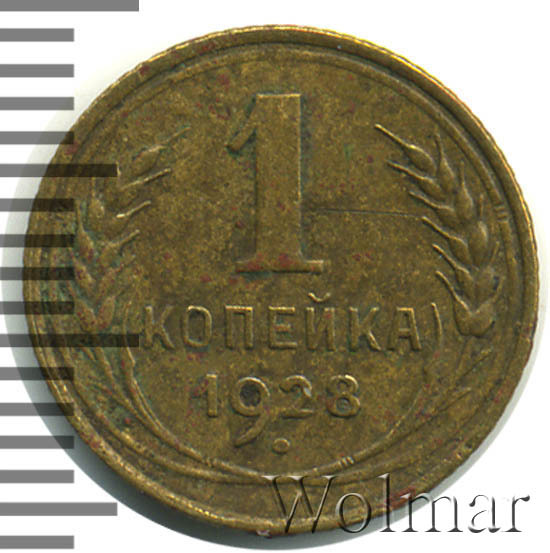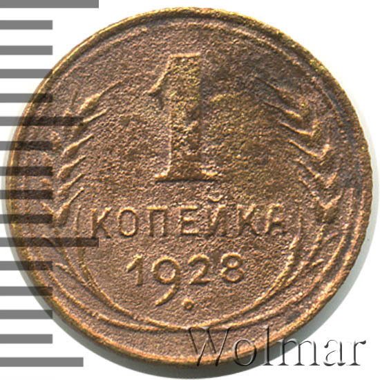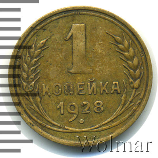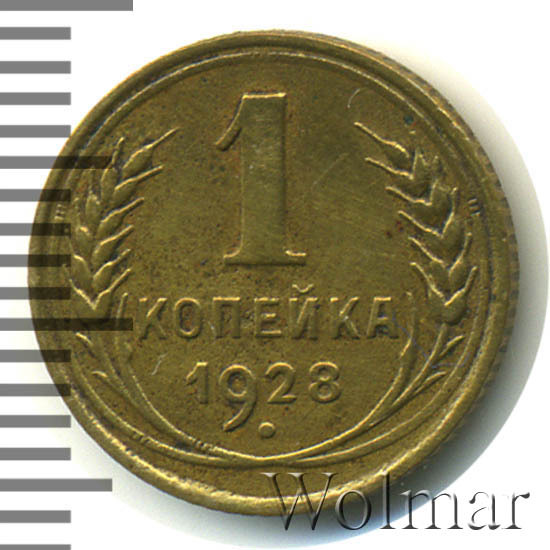 1 копейка 1928 года. Самый младший номинал разменных монет Страны Советов. В 1928 году, было выпущено восемь различных номиналов (от медной полкопейки до 20 коп.). Чеканка велась на Ленинградском монетном дворе. Одна копейки 1928 года небольшая монета, весом в 1 грамм. Производились из немагнитного сплава алюминиевой бронзы, жёлтого цвета. Отношение сторон монеты друг к другу (соостность) – медальное (0 градусов).Тип бронзовых одно копеечных монет 1926 – 1935 гг. Тираж доподлинно не известен.