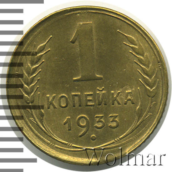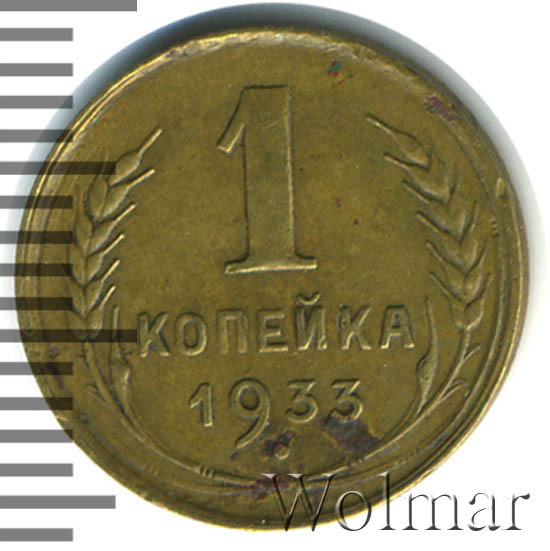 Копейка 1933 весом ровно в 1 грамм чеканилась из сплава алюминиевой бронзы. После 1928, последнего года выпуска монет в пол копейки, это был самый маленький номинал советской разменной мелочи. Для 1 копейки из-за крохотного размера поля и рисунка характерны частые браки такие, как непрочеканы деталей оформления и расколы штемпеля. Стоимость 1 копейки 1933 не большая, известны три разновидности, две из которых считаются частыми и отличаются только расположением цифр даты по отношению к слову "копейка". Также коллекционерам знаком более редкий новодельный чекан 50-х годов, не встречавшийся в обороте.