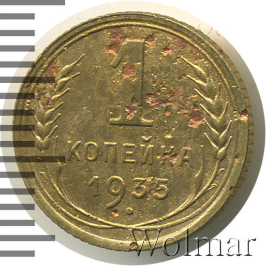 Монета номиналом в одну копейку 1935 г. – тиражная, разменная монета, образца бронзовых монет 1926 – 1935 гг. Так называемый старый тип, изображение на аверсе – в центре – Государственный герб, его окаймляет круговая надпись – девиз и буквы "СССР". В этом же году, дизайн аверса будет изменён и в денежное обращение выйдут монеты в 1 копейку 1935 г. т.н. нового типа.
