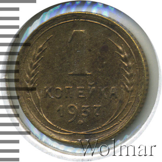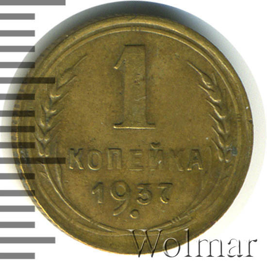 Одна копейка 1937 года, тиражная монета, для денежного оборота Советского Союза. Чеканилась на Ленинградском монетном дворе, из немагнитного сплава алюминиевой бронзы, золотисто – жёлтого цвета. Тип 1935 – 1946 гг. Отношение гербовой стороны к оборотной – медальное (0 градусов). Тираж достоверно неизвестен. Цена 1 копейки 1937г. не велика, за исключением красивых монет в превосходной коллекционной сохранности, которые могут стоить в 10 и более раз дороже.