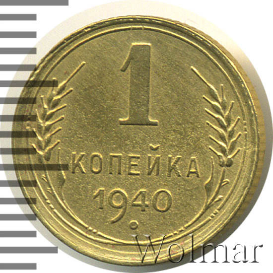Самый младший номинал (в одну копейку) разменных монет Советского Союза, отчеканен там же, где и остальные шесть, предвоенного, сорокового года - на Ленинградском монетном дворе (ЛМД). 1 копейка 1940 г. чеканилась из немагнитного сплава алюминиевой бронзы, золотисто – желтого цвета. Медальная (0 градусов) соостность сторон. Официальных данных о тираже нет.