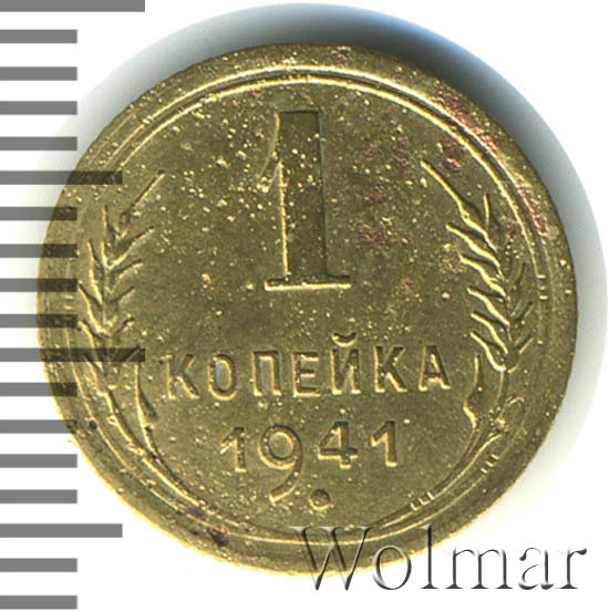 У копейки 1941 года известны три штемпельные разновидности, отличающиеся вариантами расположения узелков стебельного ободка на реверсе. Ещё существует, так называемый, новодельный чекан 50-х годов, не встречавшийся в обороте. Стоимость обычной копейки 1941 не большая, и зависит от состояния монеты и её привлекательности. Более подробно ознакомиться с ценой 1 копейки 1941 года, Вы можете во вкладке "стоимость монет", так же Вы сможете принять участие в текущих нумизматических интернет - аукционах, во вкладке "активные лоты".