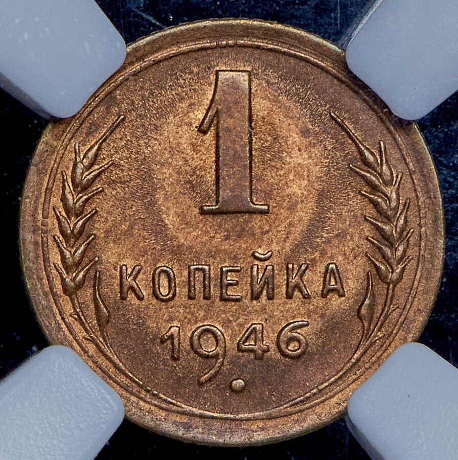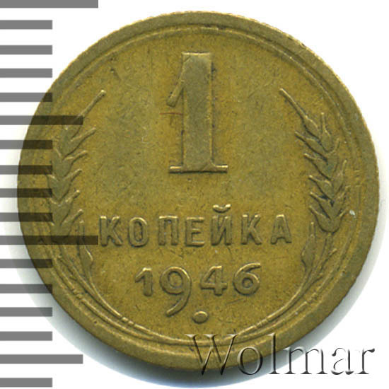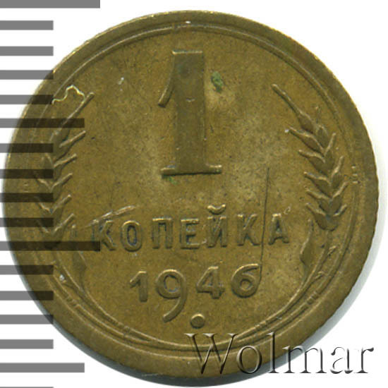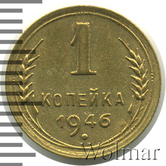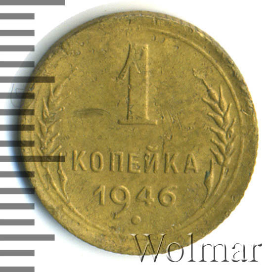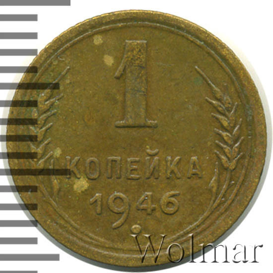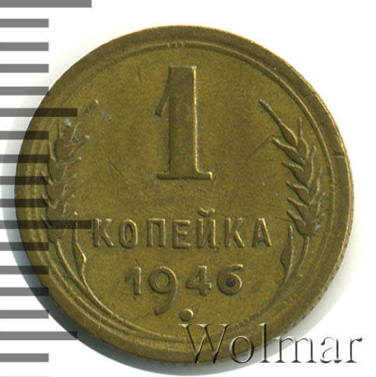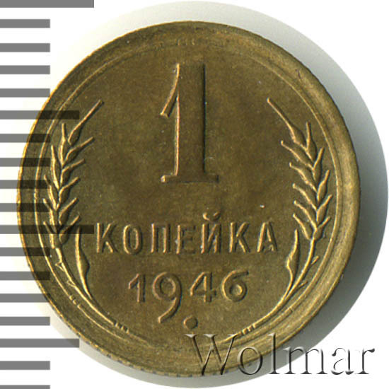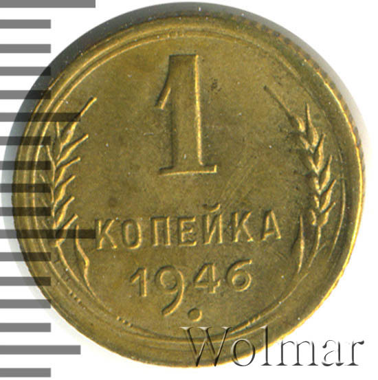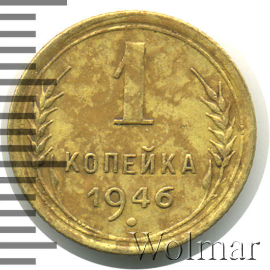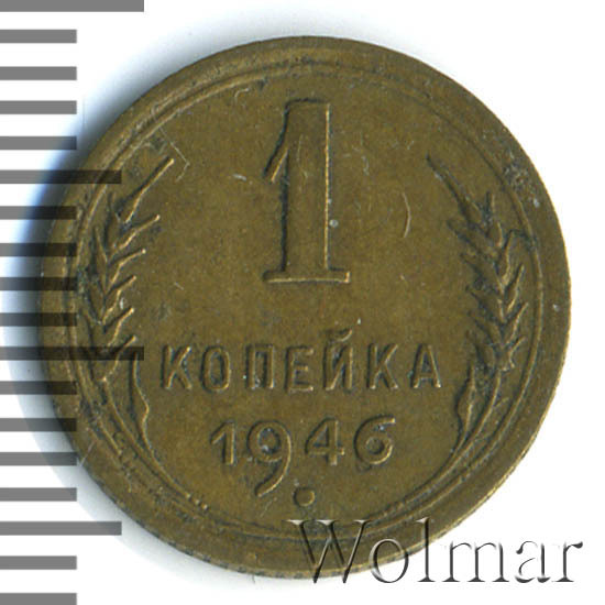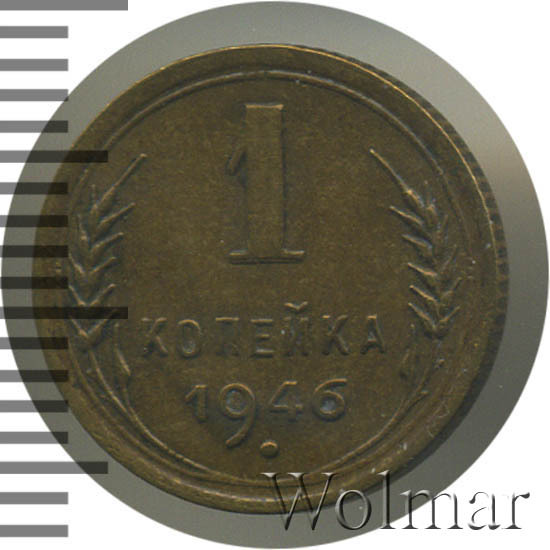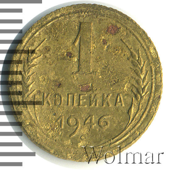 1 копейка 1946 г.- самый младший номинал разменных монет, для денежного обращения Советского Союза. Тираж до сегодняшнего дня не известен. Чеканился из бронзового сплава, золотисто – жёлтого цвета. По дизайну сторон монеты, весовым и геометрическим параметрам, соответствует одно копеечным монетам, образца 1935 – 1946 гг. Производство велось на Ленинградском монетном дворе. Отношение лицевой стороны к оборотной – медальное (0 градусов). Известных разновидностей нет.