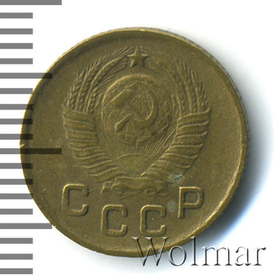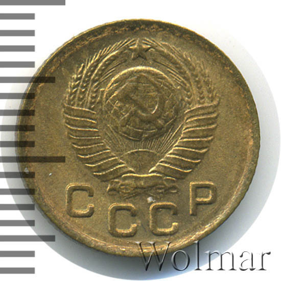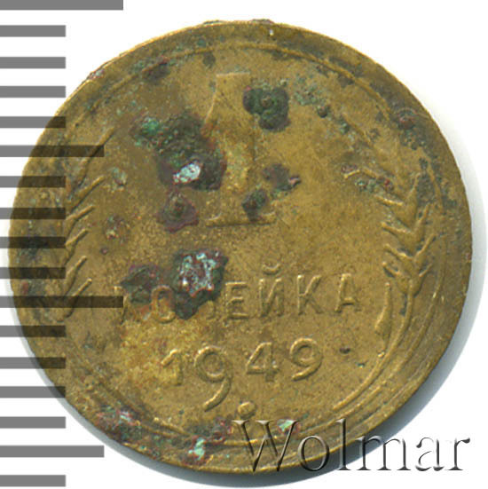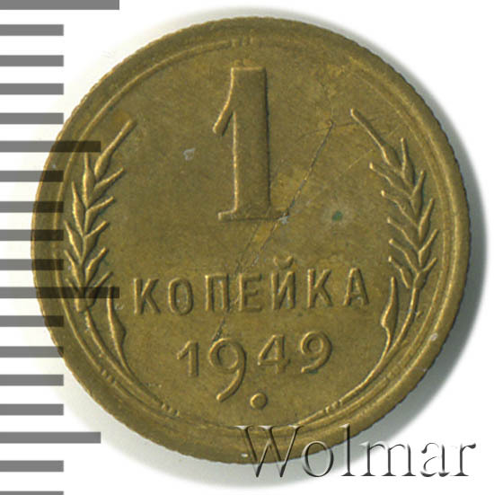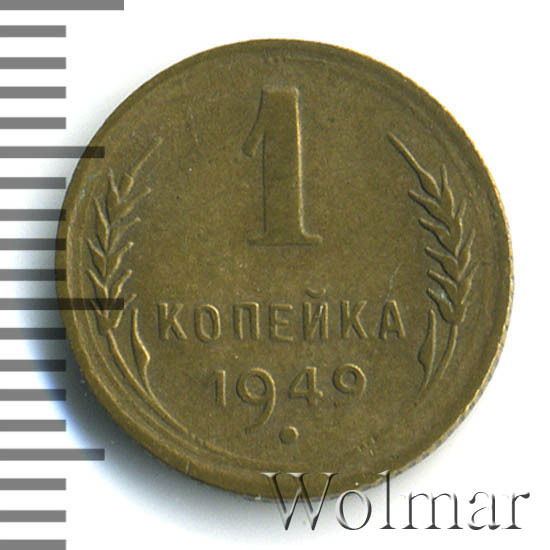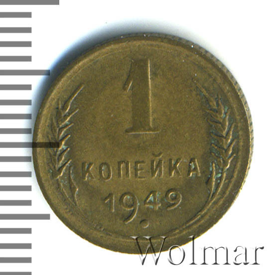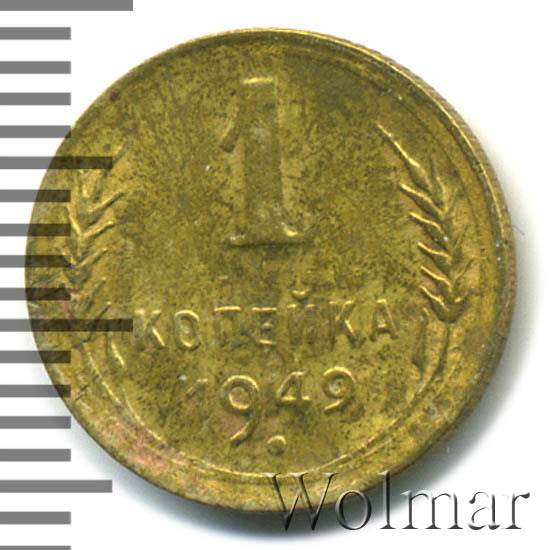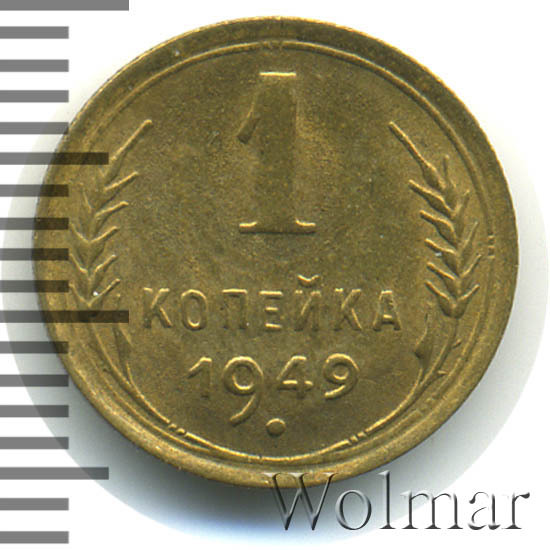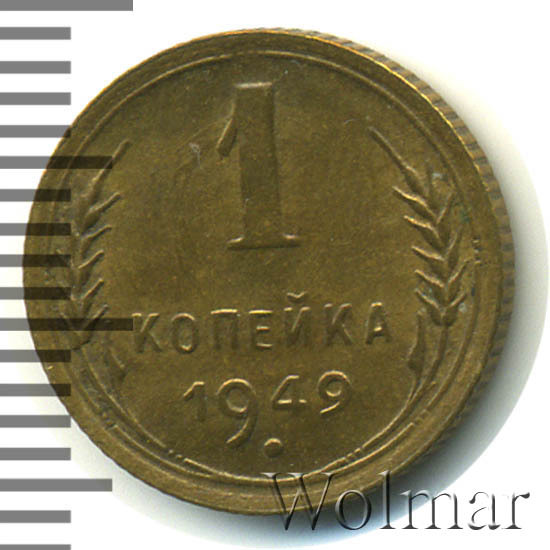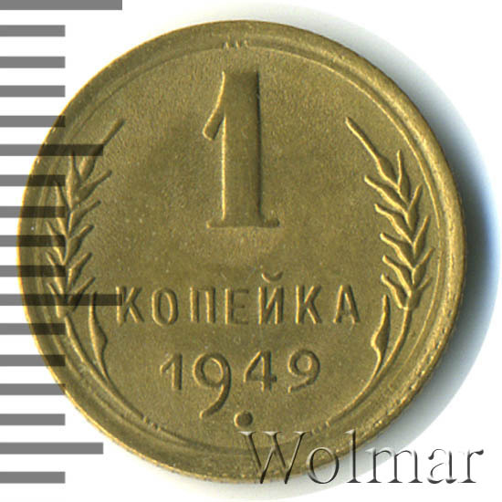 Тиражная монета для денежного оборота Союза Советских Социалистических Республик. 1 копейка 1949 года чеканилась из немагнитного сплава алюминиевой бронзы, жёлтого цвета. Такой тип копеечных монет чеканился с 1948 по 1957 года. Расположение сторон монеты (аверса к реверсу) – медальное. Все семь номиналов, выпущенных в обращение в 1949 году, были отчеканены на Ленинградском монетном дворе (ЛМД). Рядовая монета, цена 1 копейки 1949 г. высока только в превосходном коллекционном состоянии MS.