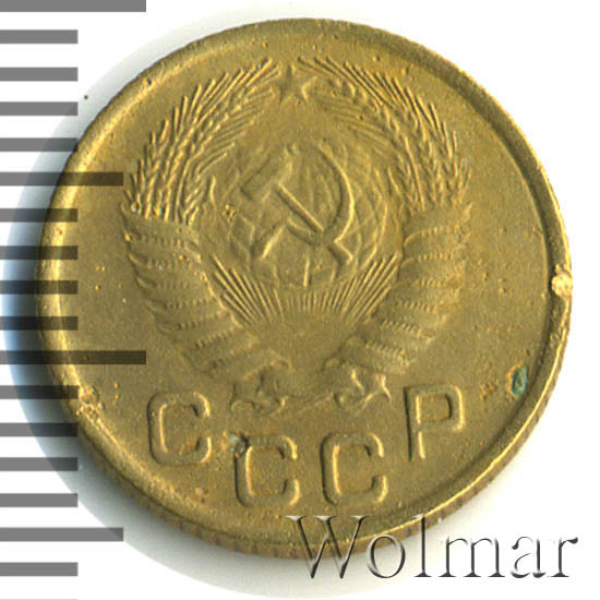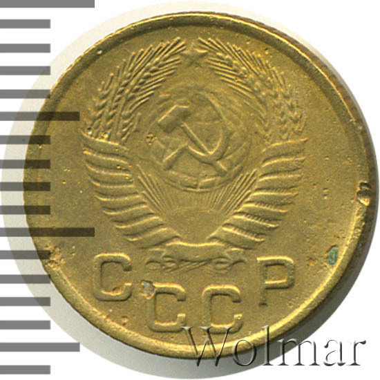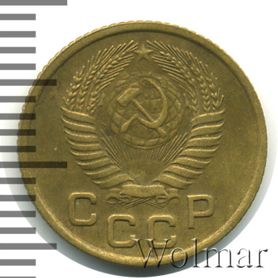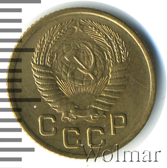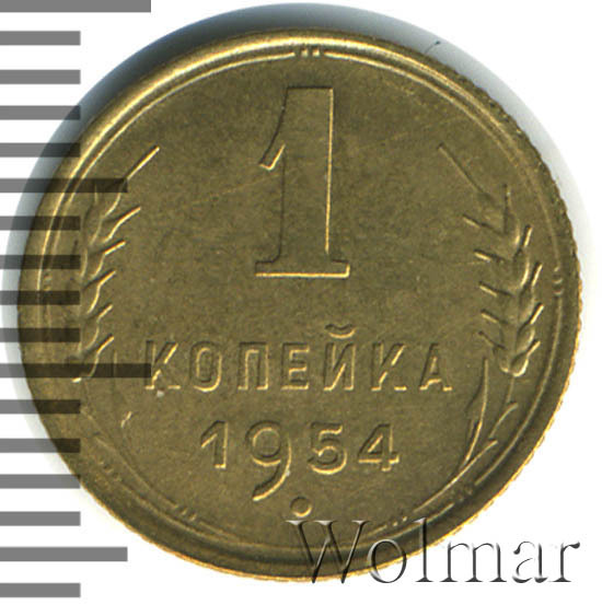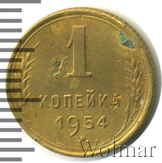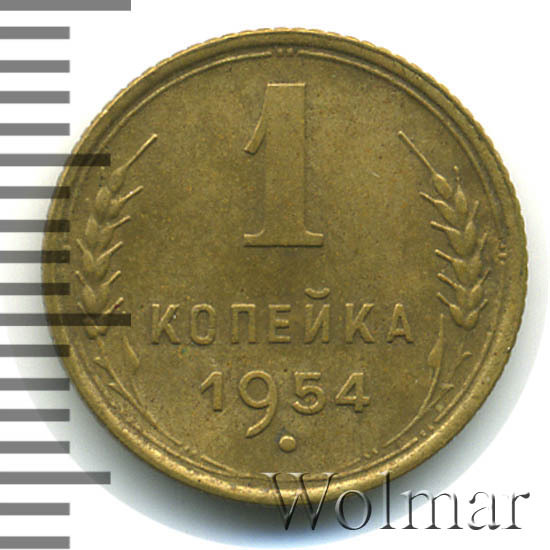 1 копейка 1954 года. Разменная монета, один из 7 номиналов регулярного чекана, выпущенных в этом году. Расположение аверса к реверсу медальное - 0 градусов, чеканилась из сплава алюминия и бронзы, тиражная, образца 1948 – 1957 годов. В этот год США провело первое испытание водородной бомбы на Атолле Бикини. А сборная Советского Союза по хоккею, дебютанты чемпионата, разгромили канадцев со счётом 7-2 и стали чемпионами мира. Наша страна вступает в Организацию Объединённых Наций по вопросам образования, науки и культуры ЮНЕСКО.