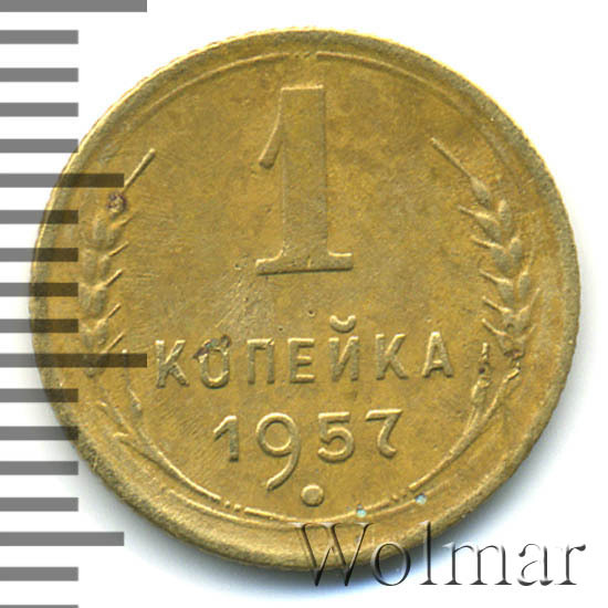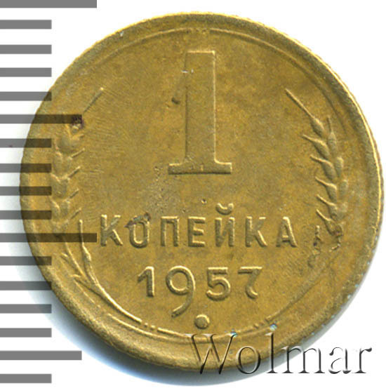 1 копейка 1957 г. отчеканена из немагнитного сплава алюминиевой бронзы, золотисто - желтого цвета. Отношение гербовой стороны к реверсу – медальное (0 градусов). Тираж не известен. Штемпельных разновидностей – четыре. Цена 1 коп. 1957 определяется исходя из коллекционного состояния каждой монетки. Подробнее ознакомиться с ценой одной копейки 1957 года, Вы можете во вкладке «стоимость монет», а так же принять участие в текущих аукционах, пройдя по вкладке «активные лоты».