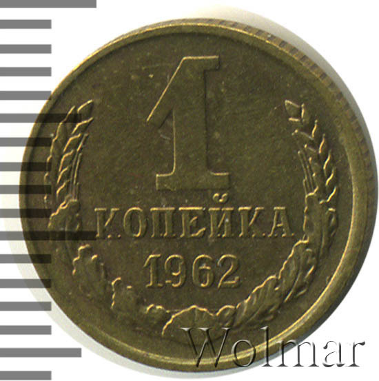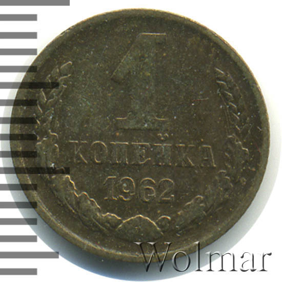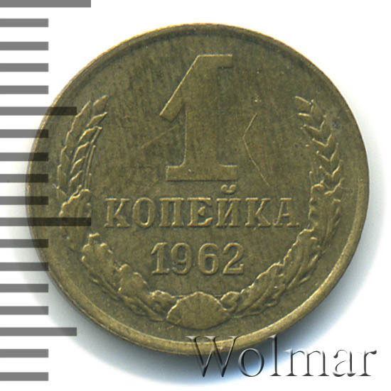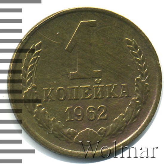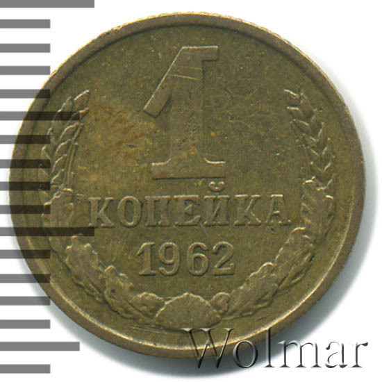 1 копейка 1962 года чеканилась в Советском Союзе из медно-цинкового сплава, во внешнем оформлении и по встречаемости в обороте эти маленькие монеты ничем примечательным не отличались от мелочи соседних годов. Гурт - рифлёный, а вес монетки ровно один грамм. Разновидностей, обычно представляющих какую-то особую ценность или редкость, у данного номинала не известно. Лицевая сторона - герб государства с пятнадцатью витками ленты, с узкими и не глубокими линиями координатной сетки земного шара. На реверсе - цифра номинала и года выпуска в венке из традиционных колосьев и дубовых листьев. Цена 1 копейки 1962 не велика, особенно для монеты из оборота, в обычном состоянии. Люксовая копеечка в штемпельном блеске, конечно, стоит в несколько раз подороже, но и такую идеальную монетку найти для коллекции не составит большого труда и затрат.