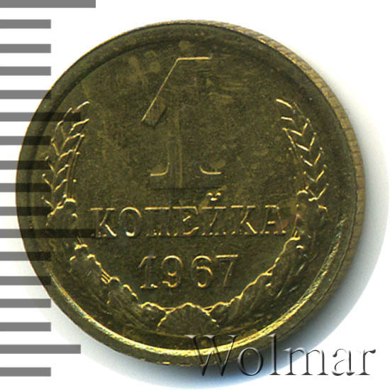Медно-цинковая копеечка 1967 весила ровно 1 грамм. Нумизматы различают три штемпельных разновидности этой маленькой монеты. Редкими считаются копейки с лицевой стороной, на которой у вторых колосьев по бокам от земного шара нет остей, а между центральным связующим витком и нижней правой лентой четыре или пять стеблей (шт. 1.31 и 1.32). Более распространёнными являются копейки 1967, вторые колосья у которых изображены с остями.