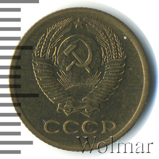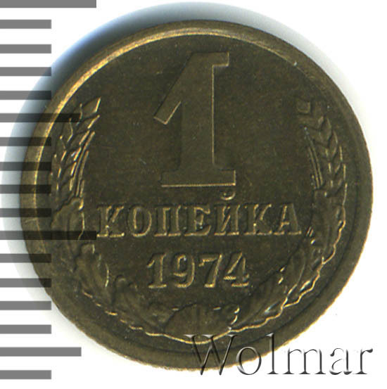 Копейка, самый младший номинал разменной мелочи СССР, регулярно и массово производились из немагнитного латунного сплава, жёлтого цвета. Отношение сторон друг к другу – медальное. 1 копейка 1974 года, образца 1961 – 1991 года. Чеканилась на Ленинградском монетном дворе, как для оборота, так и для наборов монет (улучшенного качества) Госбанка Советского Союза.