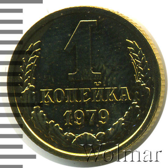 Одна копейка 1979 г., по весовым, геометрическим параметрам и дизайну, относится к типу 1961 – 1991 годов. Младший номинал для денежного обращения Союза Советских Социалистических Республик. Чеканка Ленинградского монетного двора. Тираж доподлинно не известен до сегодняшнего дня. Медно – цинковый сплав, немагнитный, желтого цвета. 1 коп. 1979 г. производились по двум технологиям: обычного качества чеканки – для обращения и, улучшенного, для годовых наборов Государственно банка СССР. Соотношение аверса к реверсу - медальное. Известных штемпельных разновидностей нет, в отличие от 20 коп.