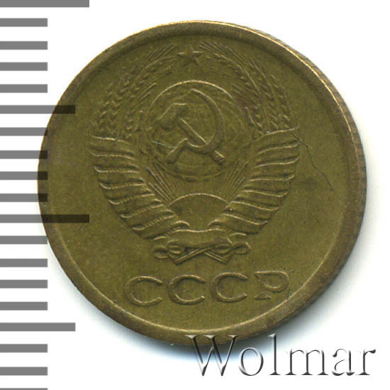 Довольно редкая разновидность 1 копейки 1983 г. Встречается как в наборах годовых монет Государственного Банка СССР (улучшенного качества чеканки), так и среди одно копеечных монет обычной чеканки из обращения. Чеканка велась на ЛМД (Ленинградский монетный двор). Материал изготовления – латунь. Соосность аверса (гербовой стороны) к реверсу (оборотной) – медальная. Тип 1961 – 1991 годов.