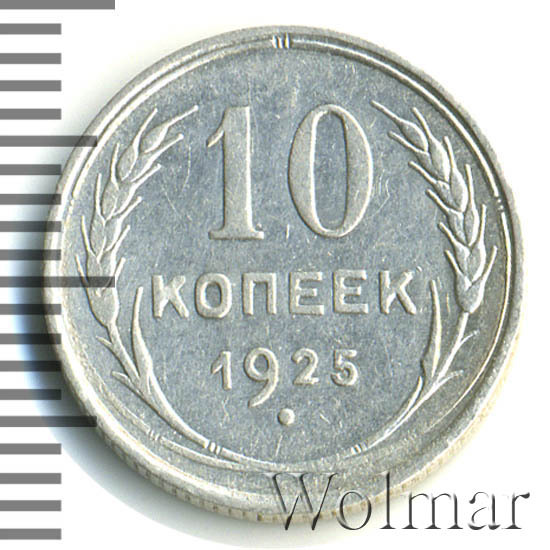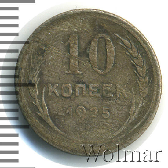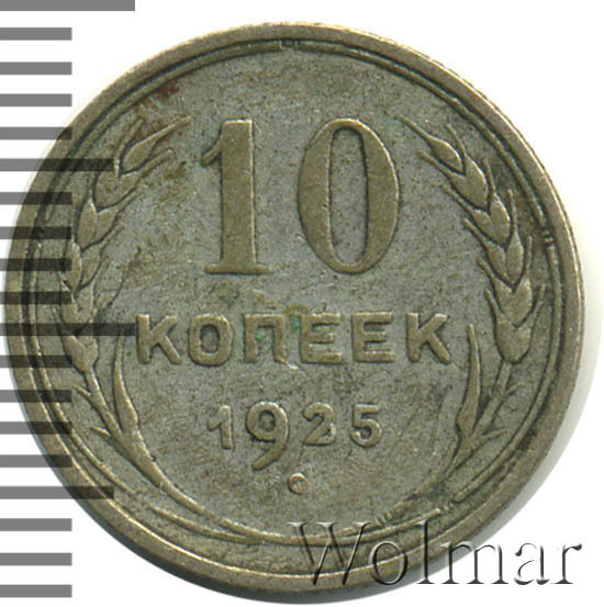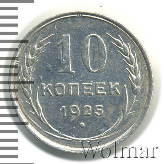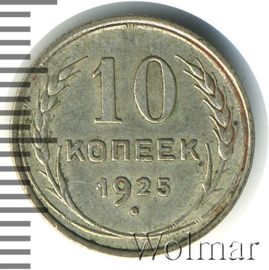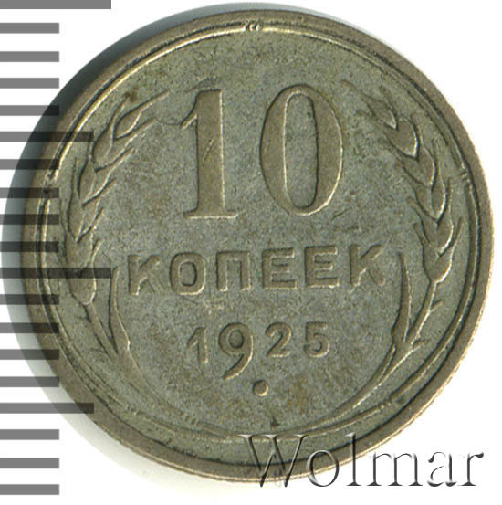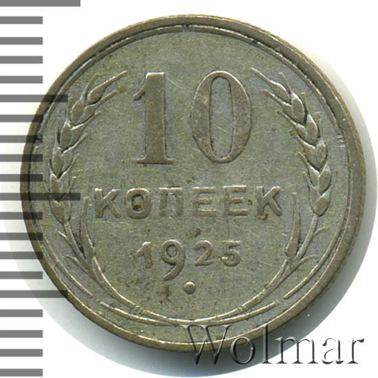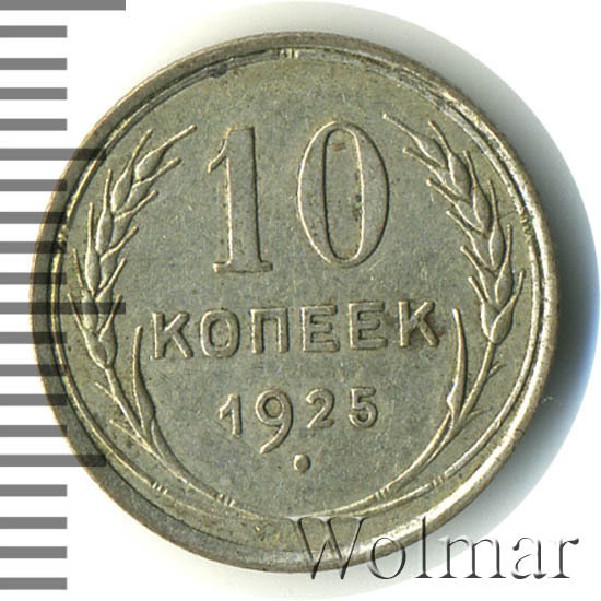 В 1925 году Ленинградский монетный двор выпускает в оборот семь монет разменной мелочи. Самый малый номинал - полкопейки, самый большой - полтинник с молотобойцем. 10 копеек 1925 года считаются довольно-таки заурядной монеткой того периода. Штемпельных разновидностей, увы, не известно, а тираж составил около 100 миллионов штук, и чеканился, как тогда было принято, из серебра пятисотой пробы. Цена 10 копеек 1925 не велика и в зависимости от состояния составляет примерно от 100 до 300 рублей. Небольшое количество этих биллончиков выпускалось в улучшенном качестве Proof, специально для нумизматов, и распространялось среди коллекционеров через Советскую филателистическую ассоциацию (СФА).