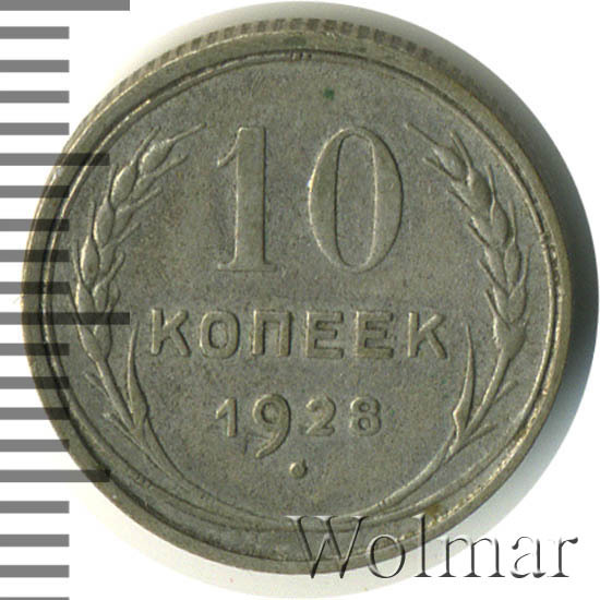 В 1928 официально началась первая "пятилетка", - пятилетний план, направленный на ускоренное развитие экономики и индустрии страны Советов под чутким руководством коммунистической партии. 10 копеек в 1928 году чеканились из серебра 500 пробы для нужд денежного обращения. Гурт у монет по обыкновению изготавливался рубчатый, а вес и размер остались без изменений ещё от монет царского периода.