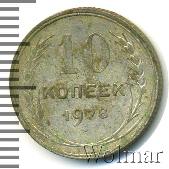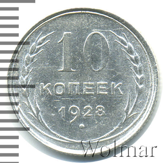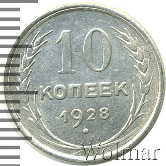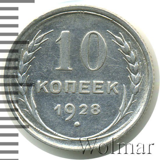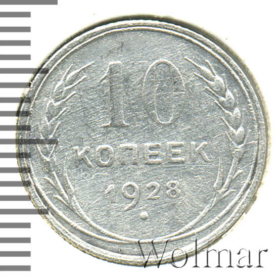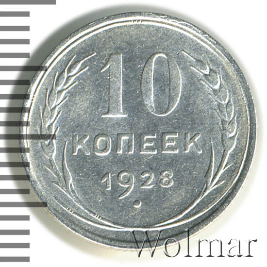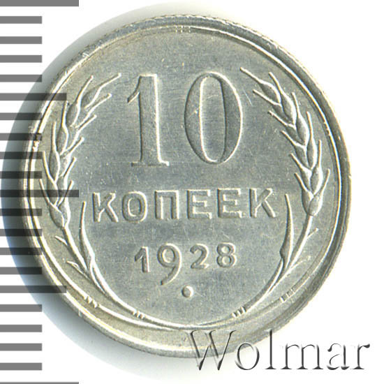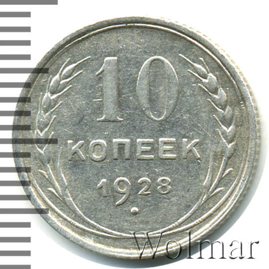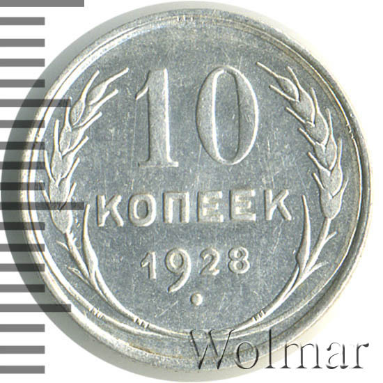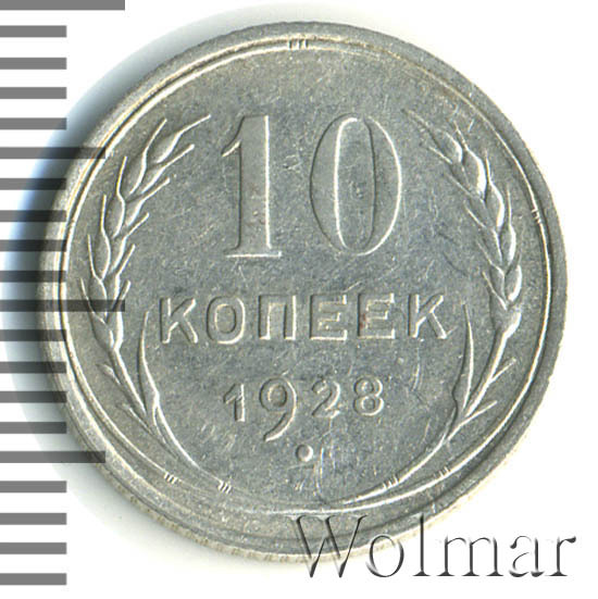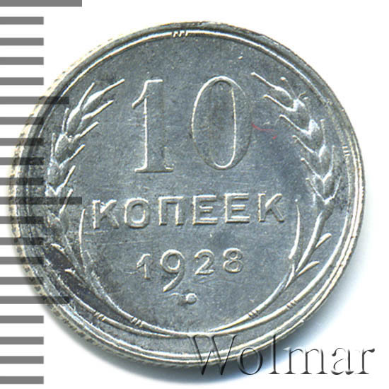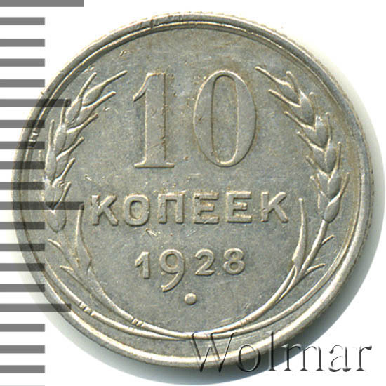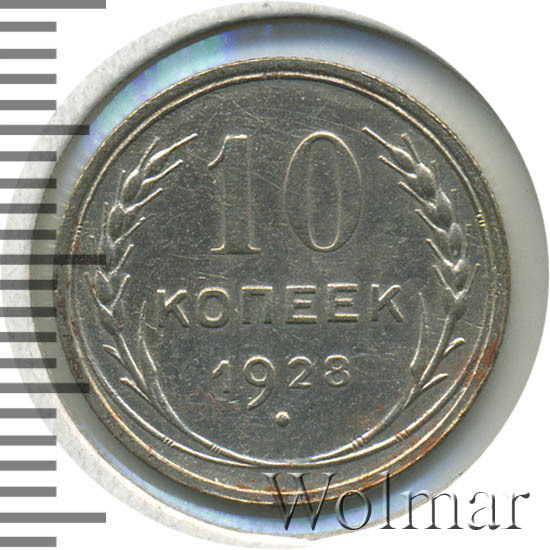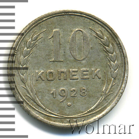 В 1928 официально началась первая "пятилетка", - пятилетний план, направленный на ускоренное развитие экономики и индустрии страны Советов под чутким руководством коммунистической партии. 10 копеек в 1928 году чеканились из серебра 500 пробы для нужд денежного обращения. Гурт у монет по обыкновению изготавливался рубчатый, а вес и размер остались без изменений ещё от монет царского периода.