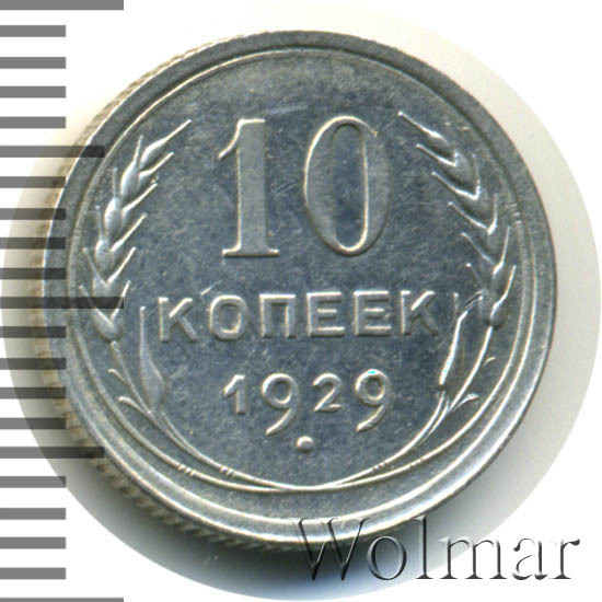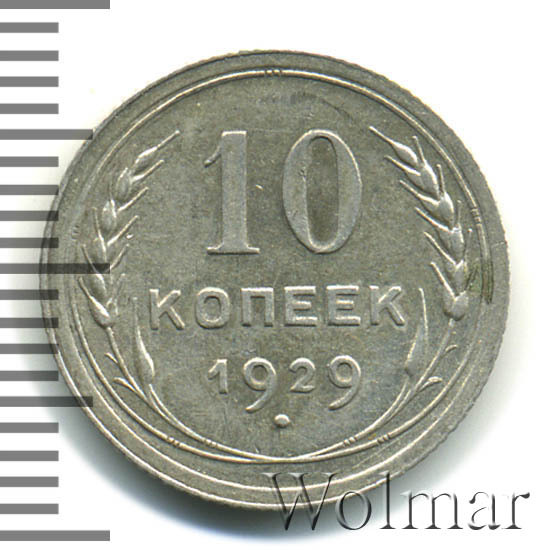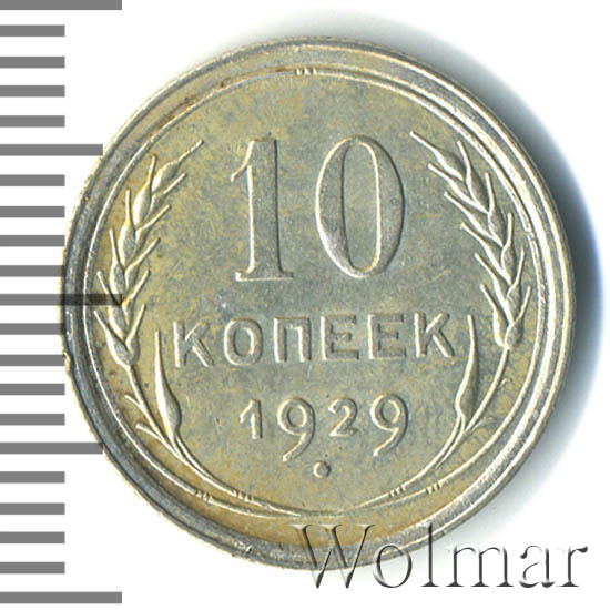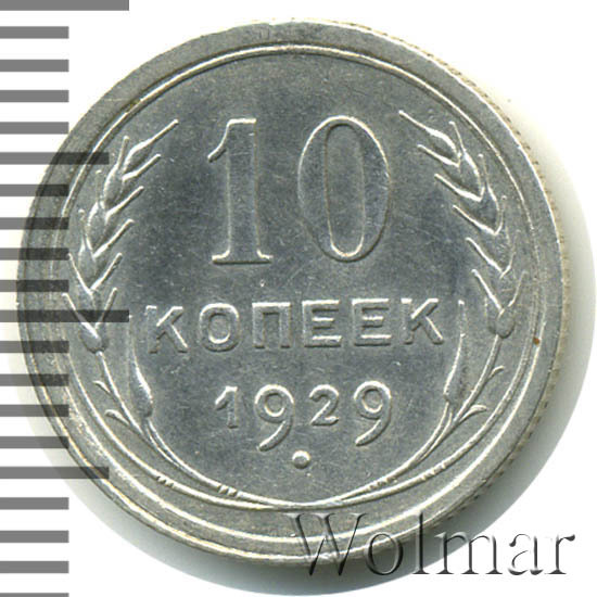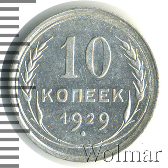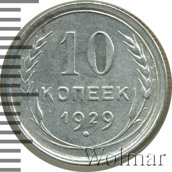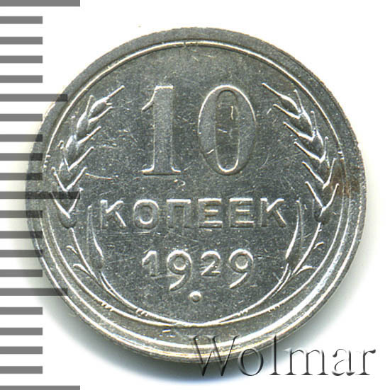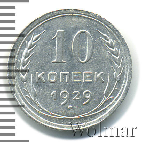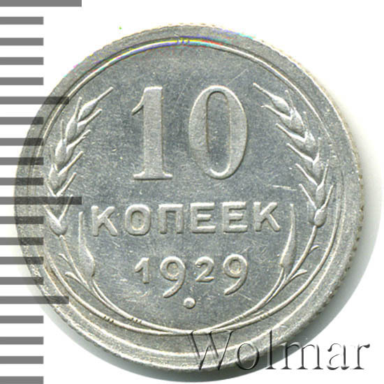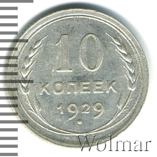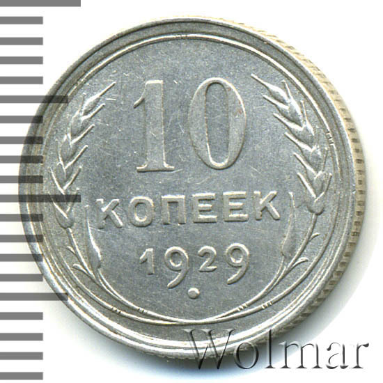 10 копеек 1929 года, чеканились на Ленинградском монетном дворе (ЛМД). Там же производились и остальные шесть номиналов, выпущенные в денежное обращение СССР в одна тысяча девятьсот двадцать девятом году.