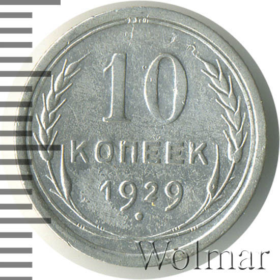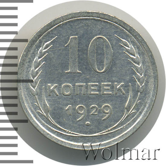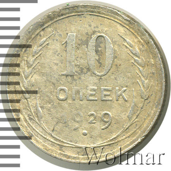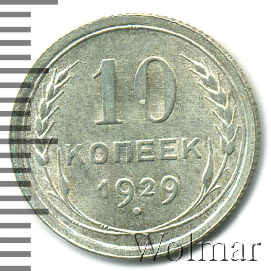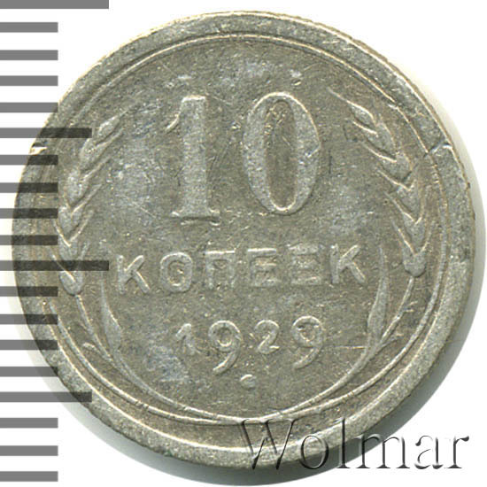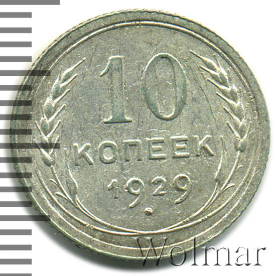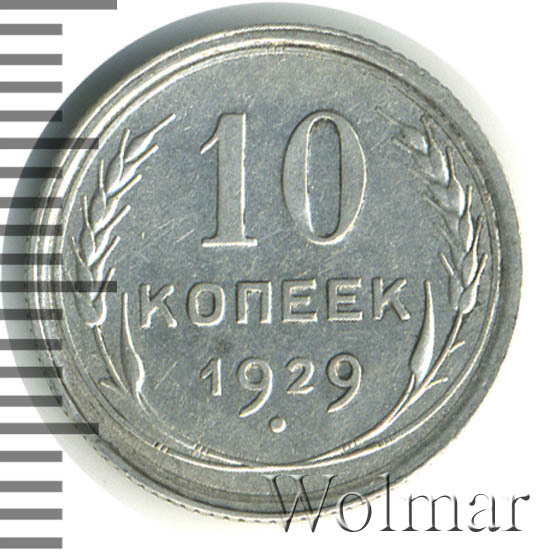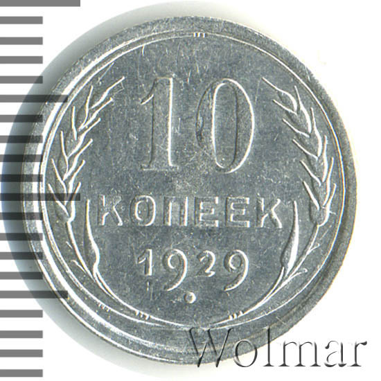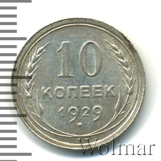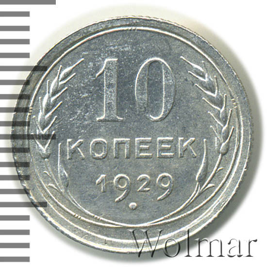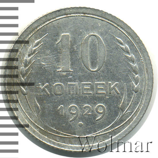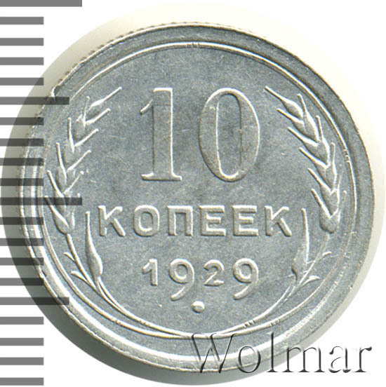 10 копеек 1929 года, чеканились на Ленинградском монетном дворе (ЛМД). Там же производились и остальные шесть номиналов, выпущенные в денежное обращение СССР в одна тысяча девятьсот двадцать девятом году.