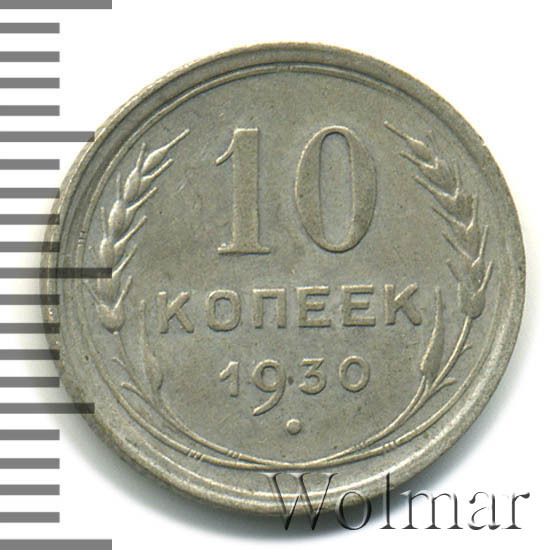 Рядовая серебряная монетка, номиналом в 10 копеек, массово выпускались в денежное обращение Советского Союза, с монетного двора, расположенного в городе Ленинграде.Соответствует, по геометрическим, весовым параметрам и дизайну сторон, типу 10-ти копеечных монет, образца 1924 – 1931 гг. нумизматическая ценность 10 коп. 1930 не велика, если монетка в среднем качестве, в отличном и превосходном состоянии, стоимость 10 копеек 1930 г, может увеличиться в десять раз.