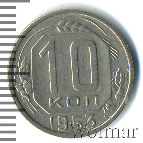 Десять копеек 1953 г. – рядовая, тиражная монета для денежного оборота Советского Союза. Чеканилась из немагнитного медно - никелевого сплава (мельхиор), белого цвета, по стандартам, принятым для десяти копеечных монет, образца 1948 – 1957 годов. Соостность (расположение лицевой стороны к оборотной) – медальная, как у всех монет советского периода. Тираж доподлинно не известен. Цена, 10 копеек 1953 года, определяется коллекционным состоянием каждого экземпляра. Для 10 коп. в отличном качестве, возрастает в несколько раз.