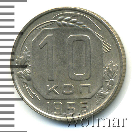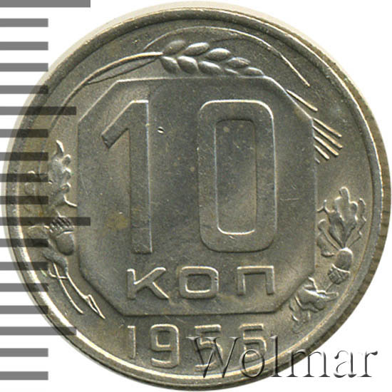 Монета регулярного выпуска СССР. 10 копеек 1956 года – рядовая монета. Материал для чеканки – мельхиор. Отношение лицевой стороны (аверс) к оборотной (реверс) – медальное.