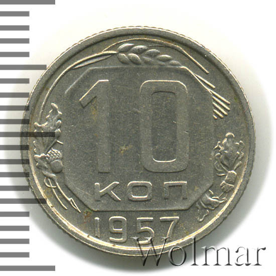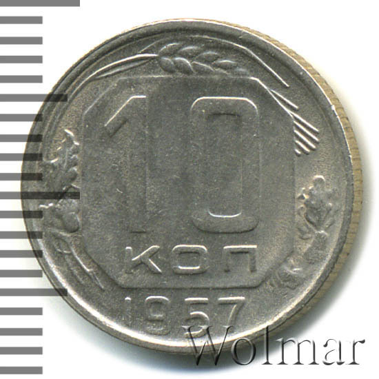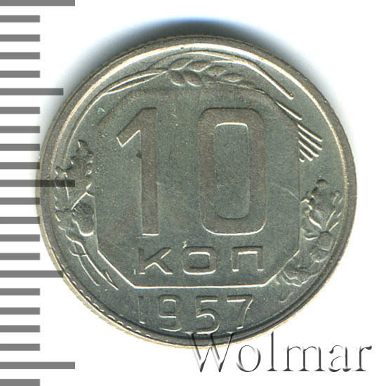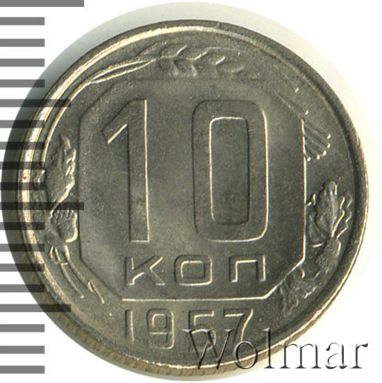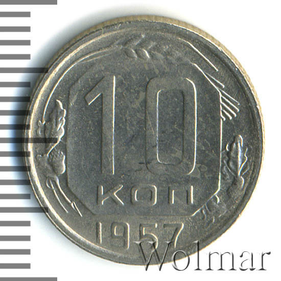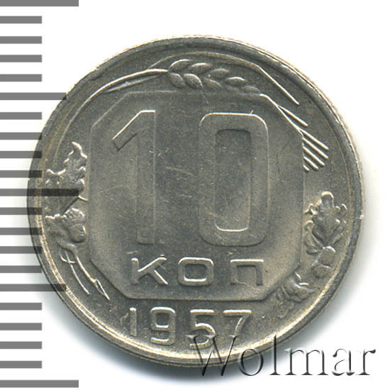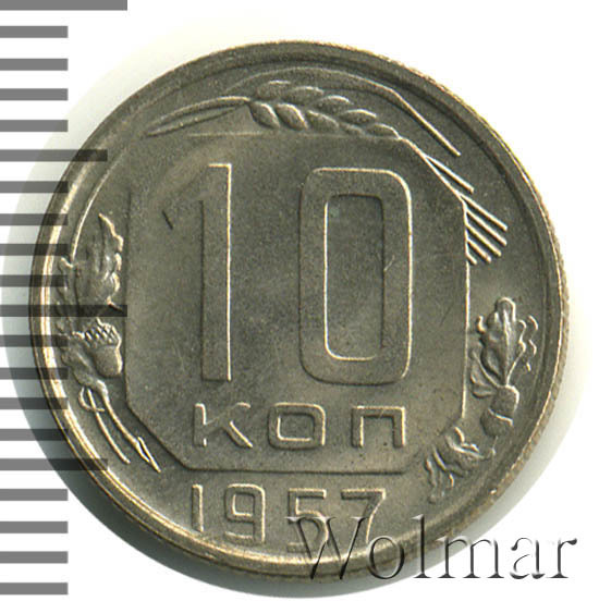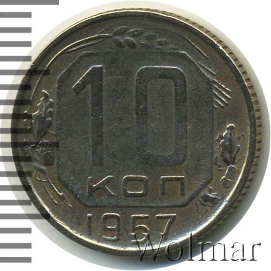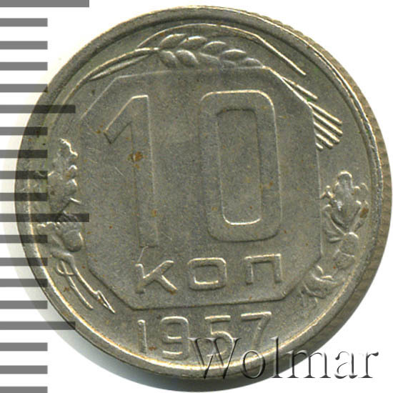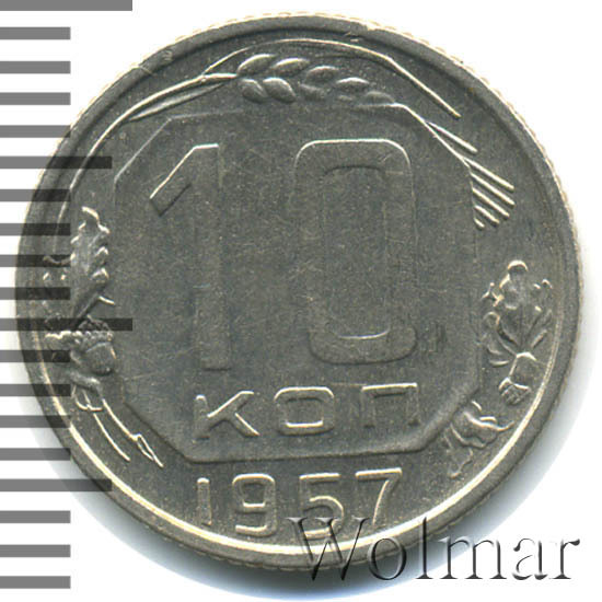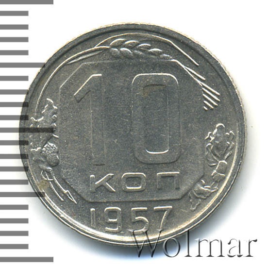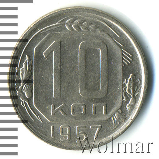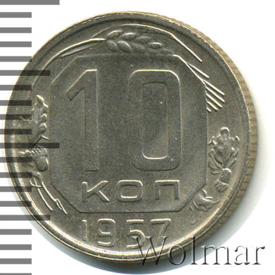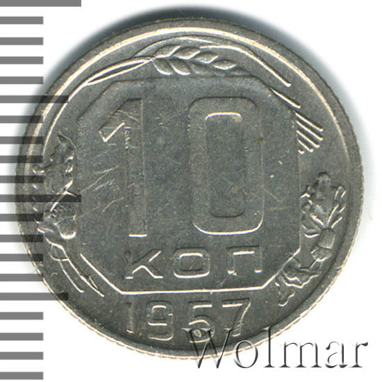 Монета регулярного выпуска, для денежного обращения СССР. 10 копеек 1957 года – рядовая монета. Материал для чеканки – мельхиор, немагнитный, белого цвета. Тип 1948 – 1957 гг. Отношение лицевой стороны (аверс) к оборотной (реверс) – медальное.