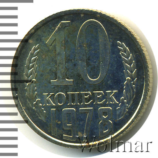 Тиражная, разменная монета для денежного обращения Советского Союза. Один из 9 номиналов отчеканенных на Ленинградском монетном дворе в 1978 году. Принадлежит типу монет 1961 – 1991 гг. выпуска. Металл изготовления: нейзильбер (медно - никелевый сплав, белого цвета). Тираж большой, монетка частый гость в любой копилки с советской мелочью. Чеканились, монеты в 10 копеек, наряду с другими номиналами как для обращения так и для наборов (улучшенного качества) Государственного Банка СССР, которые производились специально для нумизматов. Распространялись такие годовые наборы как внутри страны, так и за границей. Разновидностей (см. описание аверса) пять. Все они равнозначны, особенно отметить одну из них не представляется возможным. Цена на 10 копеек 1978 г. минимальна и откланяется в большую сторону только у гривенников в превосходном состоянии.