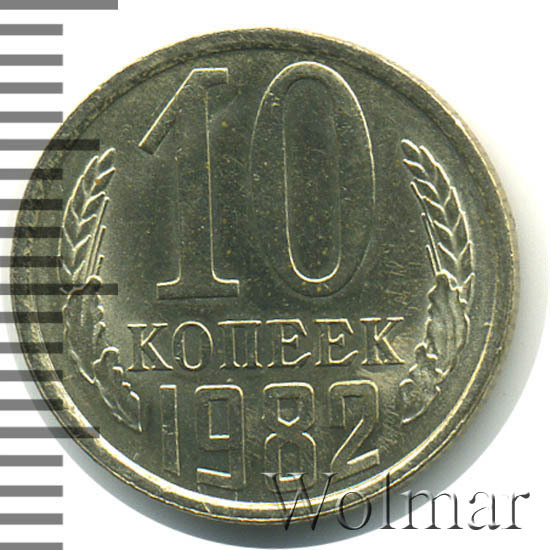 Монета в 10 копеек, выпущенная в год шестидесятилетия образования Союза Советских Социалистических Республик. Основанного 30 декабря 1922 года и просуществовавшего 69 лет, до 1991 года. Медно-никелевый «гривенник» 1982-го года, чеканился на Ленинградском монетном дворе. Имеет две разновидности, одна из которых (на фотографии), лиц. сторона шт. 2.1 (правая гребёнка с уступом), довольно редка. Имеет не плохую стоимость, в зависимости от состояния монеты, в отличие от обычной разновидности 10 копеек 1982,цена на которую (даже в состоянии UNC) мизерна. К 60 - ти летию СССР, Государственным Банком был выпущен памятный, юбилейный рубль в обычном качестве и в в качестве Proof. Ниже приведены статистические данные, построенные на основе прошедших аукционов. По ним Вы можете узнать актуальную на данный момент, стоимость 10 копеек 1982 года.