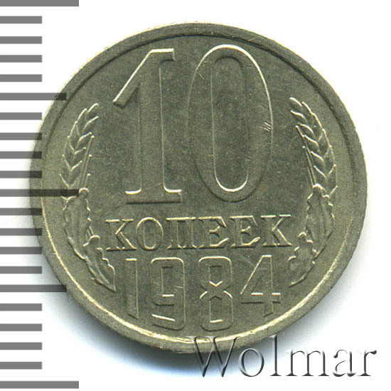 Разменная монета для денежного обращения Советского Союза. Один из девяти номиналов, отчеканенных в этом году монет различного качества: для обращения и, улучшенного, для годовых наборов Государственного Банка СССР. Была отчеканена в сплаве нейзильбер (медно - никелевый немагнитный сплав), белого цвета. Соостность сторон монеты – медальная. Тираж гривенников 1984 г. был довольно большим, постоянно встречаются в погодовки советского периода. Разновидность, рассматриваемая на этой странице каталога, встречается как в набора ГБ, так и в обороте (обычной чеканки). Цена на 10 коп. 1984 г. шт. 2.3 (см. описание аверса) не большая, даже в отличном качестве. Это относится и к наборным монетам. Довольно редкий разновид этого гривенника с лицевиком 2.1 (с уступом) , рассматривается на отдельной странице. Стоимость этой разновидности в десять раз превышает цену (в похожем состоянии) 10 копеек 1984 г. шт. 2.3 (без уступа).