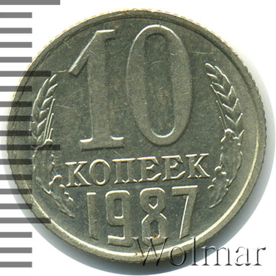 Монета 10 копеек 1987г. Разменная монета для денежного обращения Советского Союза. Была отчеканена в сплаве нейзильбер (медно-никелевый сплав), белого цвета. Расположение сторон – медальное. Тип 1961 – 1991 гг. Тираж 10 копеек 1987 огромен, массово встречается в погодовки после реформенных гривенников. В 1987 году, на Ленинградском (ЛМД) и Московском (ММД) монетных дворах, были выпущены девять номиналов монет. Выпуск предназначался как для денежного обращения (обычного качества чеканки) и, улучшенного качества, для наборов Центрального (до 1987 г. Государственного) Банка СССР.