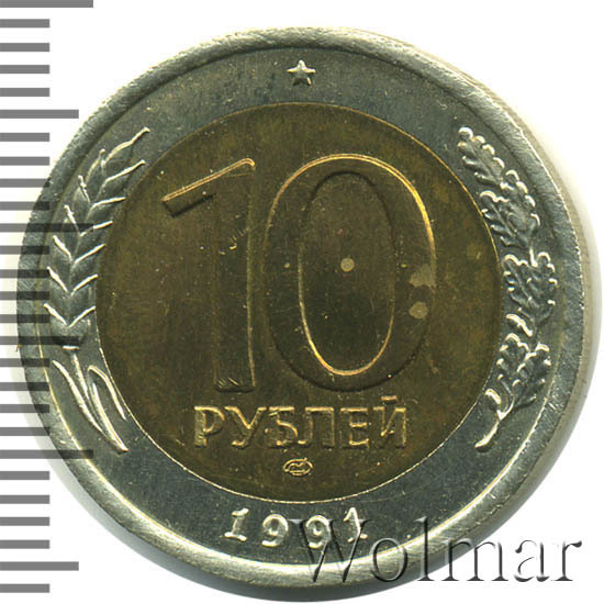 В центре немного смещенная вверх цифра «10» обозначающая номинал монеты, ниже слово «РУБЛЕЙ», под ним монограмма монетного двора (ЛМД). Внизу у края монеты год выпуска «1991». Слева колос, справа дубовая ветвь.