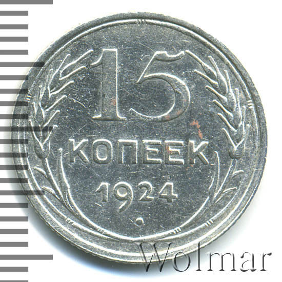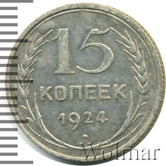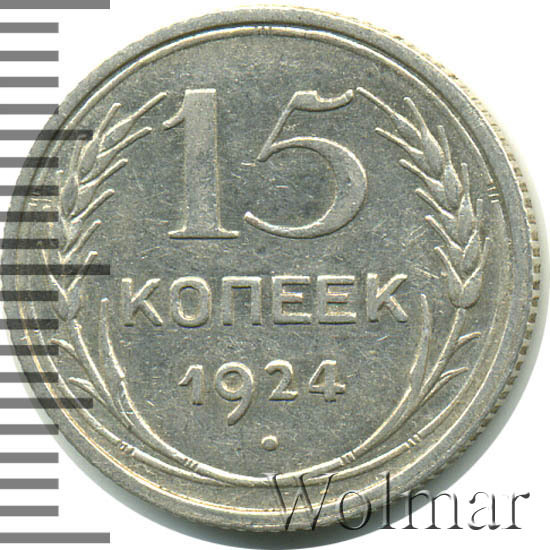 Год становления огромного по размерам и могущественного государства под названием Союз Советских Социалистических Республик. Молодая страна продолжила традиции своих предшественников и стала чеканить ходячую монету из меди и серебра. 15 копеек 1924 года, относиться к типу монет 1924-1931 годов. Материал изготовления – билон, серебро 500 пробы. Серебряные монеты СССР чеканились на Ленинградском монетном дворе, полностью соответствовали по весовым и геометрическим параметрам серебряным монетам РСФСР.