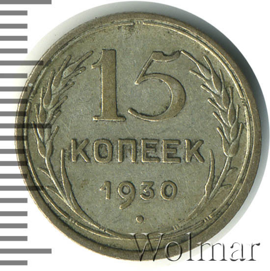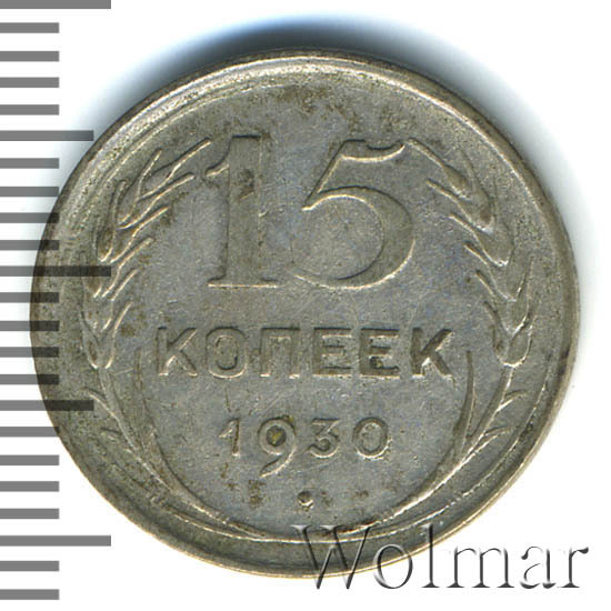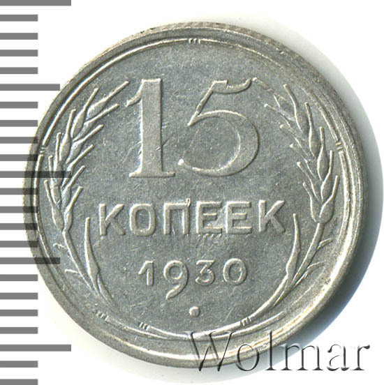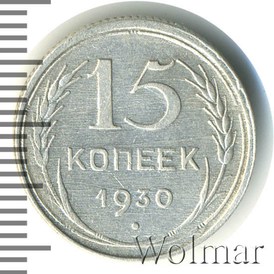 Выпуском серебряных монет в 1921-1931 годах, молодым государством Советов, была предпринята попытка заменить царскую монетную систему.15 копеек 1930 относиться к типу 1924-1931гг. Материал изготовления – билон, серебро 500 пробы. Соостность – медальная.